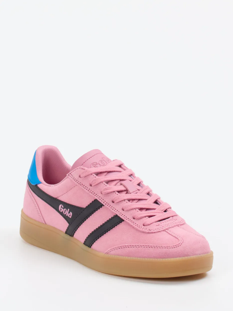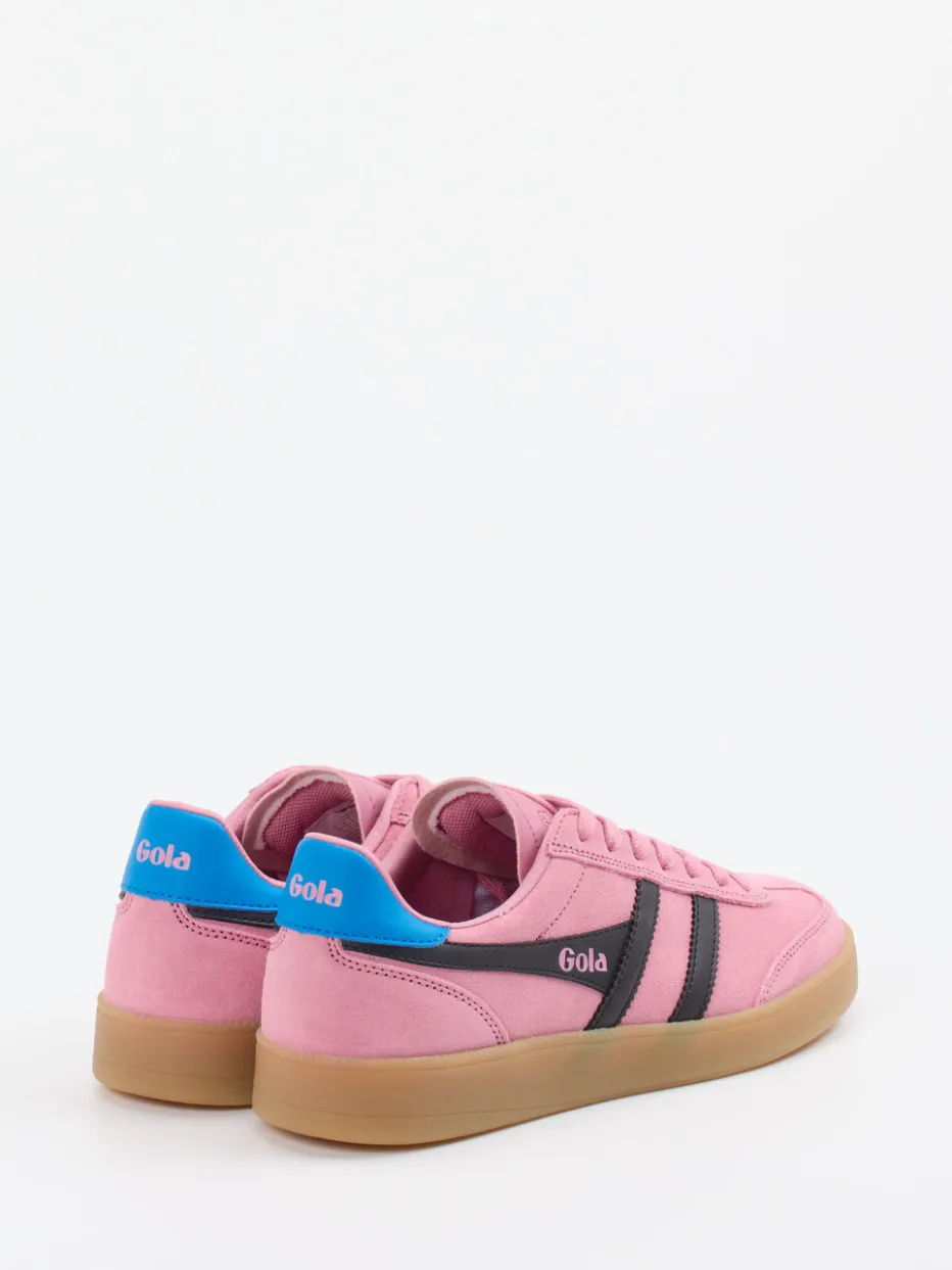 Retro-Farben mit moderner Aussagekraft.Gola liefert mit diesem Unisex-Modell einen Retro-Sneaker mit klarer Identität. Ob als Stilkontrast zu schlichten Outfits oder als Statement-Piece für Partynächte – das rosa Veloursleder mit matter Oberfläche harmoniert markant mit den schwarzen Streifen und der kobaltblauen Fersenkappe. Die flache Silhouette und eine griffige Gummisohle unterstreichen die sportliche DNA, während Logo-Prägungen auf Zunge und Seite modische Markenaffinität zeigen. Vom Y2K-Revival inspiriert, passt der Sneaker ideal zu Crossbody Bags und weißen Sportsocken. Ein charaktervoller Freizeitschuh, der expressives Design mit Gola-Authentizität verbindet.