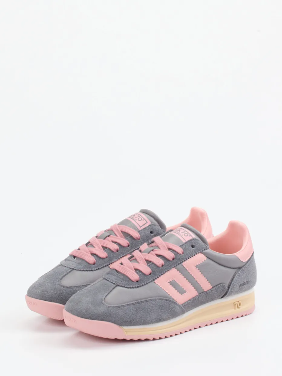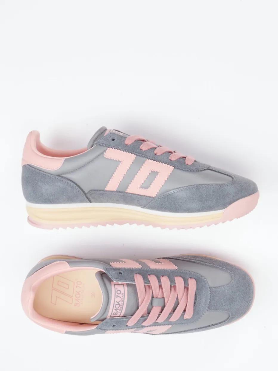 Vintage trifft Komfort.Back 70 bringt mit diesem Retro-Sneaker lässigen 70er-Charme zurück in den Alltag. Ideal für urbane Streifzüge und stilbewusste Freizeit-Ensembles überzeugt das Modell durch eine raffinierte Materialkombination: weiches Kalbleder trifft auf samtig angeschliffenes Veloursleder mit matter, genarbter Textur. Das Design zeigt sich in Mittelgrau mit pastelligen Rosa- und Cremeakzenten, schmal zulaufender Silhouette und tonigen Nähten. Seitliches Logo, markante Profilsohle und ein angenehmes Textilfutter runden den Sneaker funktional ab. Inspiriert vom „Retro Runner Revival“ entfaltet er im Streetstyle seine volle Wirkung. Ein Label-Klassiker für modebewusste Looks mit nostalgischem Flair.