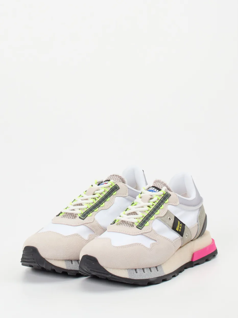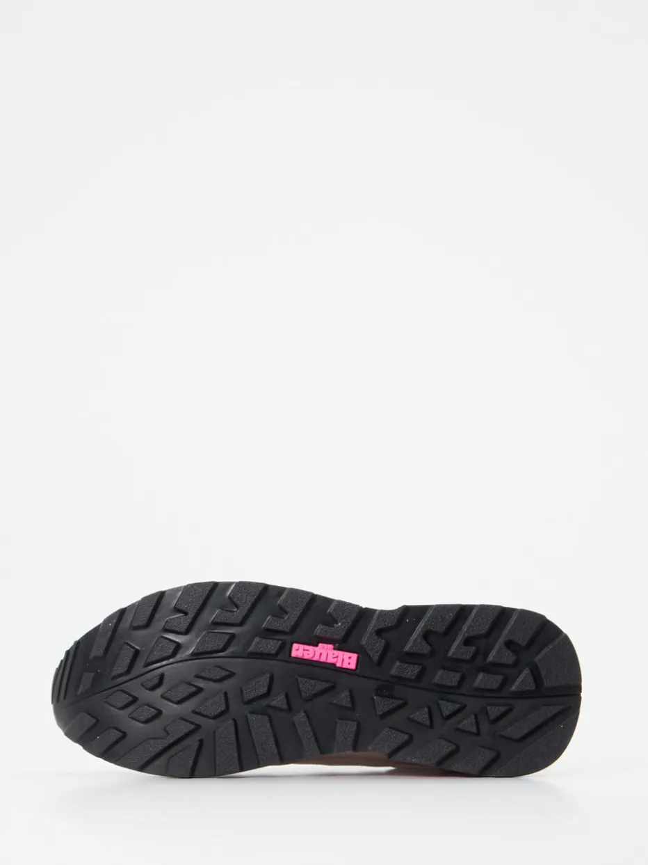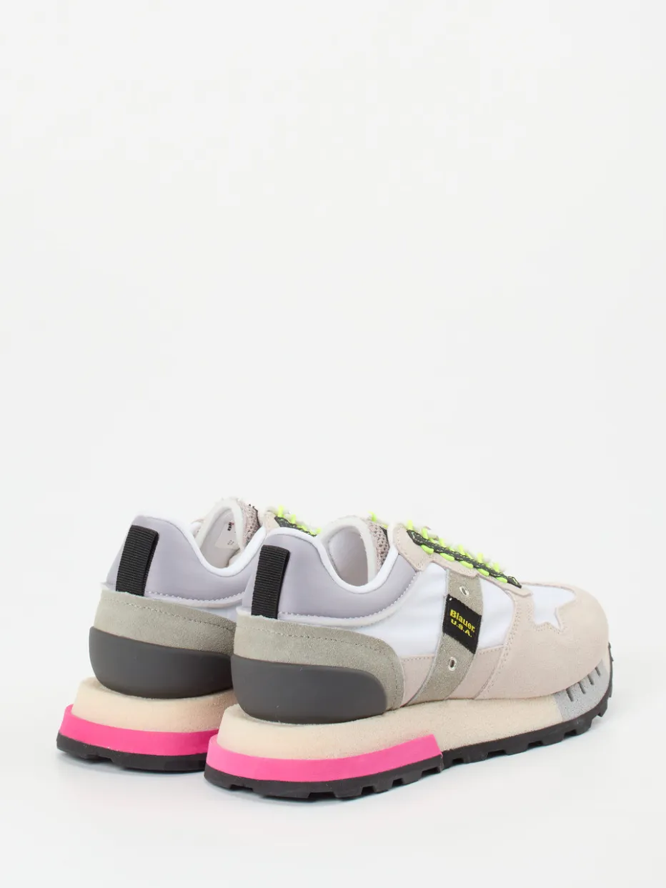 Jogging-Ästhetik trifft Neon-Trend.Die Marke Blauer bringt frischen Wind in die Sneaker-Kategorie. Ideal für urbane Looks oder entspannte Streetwear-Outfits bietet dieser Retro-Sneaker Komfort und Ausdruck zugleich. Das Obermaterial aus Veloursleder, samtig angeschliffen, kombiniert mit nylonverstärktem Mesh, schafft eine strukturierte Oberfläche in Beige, Weiß und Neonpink. Eine flache Silhouette mit Retro-Volumen sorgt für Streetwear-Charakter, während Logo-Patch, gepolsterte Zunge und kontrastreiche Chunky-Sohle mit pinkfarbenem Profil auffallen. Schnürung, bequeme Passform und gedämpftes Wechselfußbett erhöhen den Alltagstauglichkeitsfaktor zusätzlich. Perfekt zu sportlich-expressiven Outfits im Y2K-Stil. Blauer setzt urbane Statements mit funktionalem Anspruch und authentischer Designkompetenz.