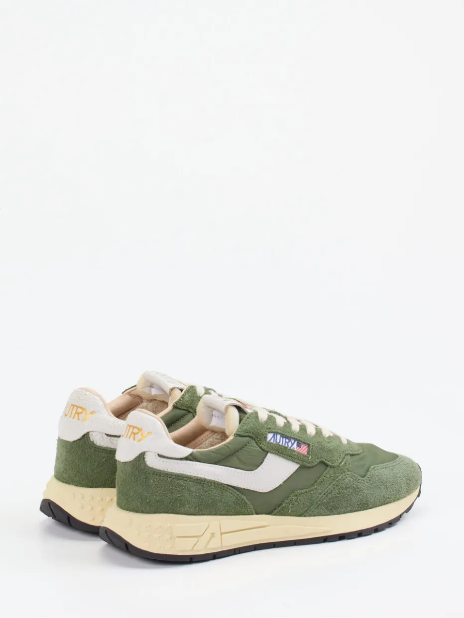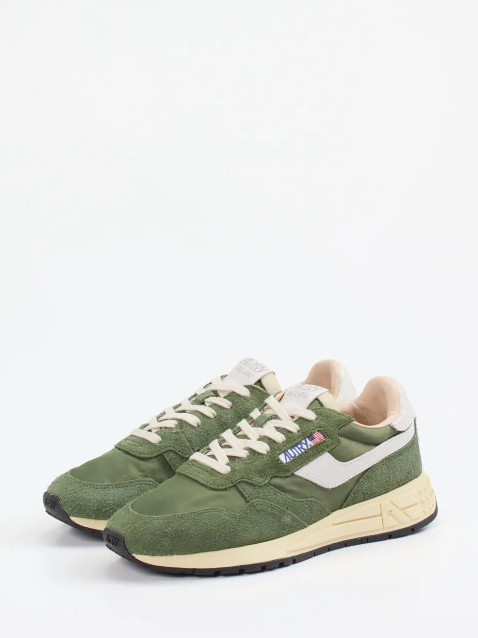 Vintage trifft Streetstyle. Autry präsentiert mit diesem Retro-Sneaker ein sportlich-urbanes Herrenmodell mit 90er-Jahre-Flair. Ideal für aktive Tage in der City oder entspannte Freizeitmomente vereint der Sneaker moosgrünes Veloursleder mit tonigem Nylon und weißen Kalbleder-Akzenten in Craquelé-Optik. Die klassische Runner-Silhouette betont einen modernen Retrostil, ergänzt durch tonale Nähte und das markante Logo mit US-Flagge. Die profilierte Gummisohle in Vanillegelb und Schwarz sorgt für stabile Traktion, während der gepolsterte Schaft und das atmungsaktive Frottee-Innenfutter hohen Komfort bieten. Im Design spiegelt sich die Color-Blocking-Ästhetik der Saison wider. Ein Sneaker mit Ausdruckskraft für stilbewusste Streetwear-Looks.