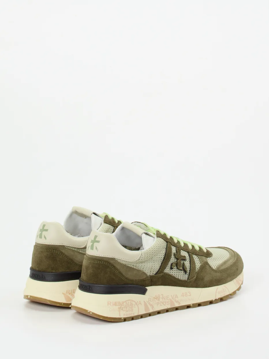 Streetwear mit Retro-Fokus.Die Marke Premiata interpretiert klassische Running-Sneaker neu. Das Modell Landeck überzeugt mit mutiger Farbkombination und innovativem Materialeinsatz. Für wärmere Tage ideal: atmungsaktives Meshtextil in Beigegrau, kombiniert mit samtigem Veloursleder in Olivtönen. Neongrüne Schnürsenkel, eine markant bedruckte, recycelte Gummisohle und das typische Branding setzen betonte Akzente im Streetstyle. Dank flacher Silhouette, wechselbarem Fußbett und Leder-/Textilfutter ist hoher Komfort geboten. Der Unisex-Look passt perfekt zum aktuellen Y2K-Trend. Ein Sneaker mit Charakter – präzise gearbeitet und stilistisch vielseitig.