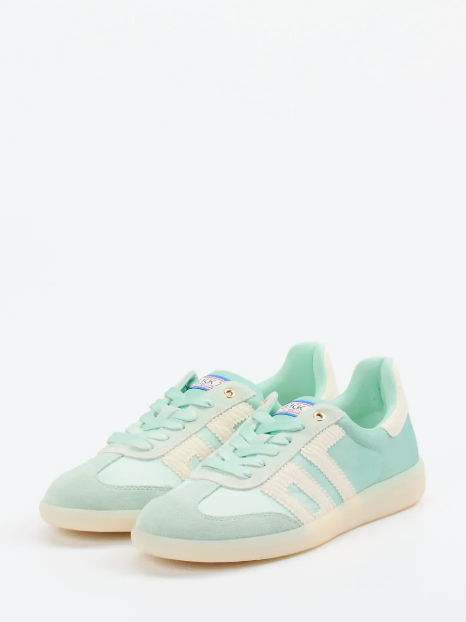 Frische Pastellpower für urbane Styles.Back 70 präsentiert mit diesem Retro-Sneaker eine stilvolle Kombination aus Streetwear und Saisontrend. Ideal für warme Tage in der Stadt bietet der Unisex-Sneaker dank atmungsaktivem Nylon in Mintgrün und samtigem Veloursleder leichten Tragekomfort. Die flach-schmale Silhouette wird von goldfarbener Öse und strukturiertem Fersenbesatz akzentuiert. Die milchige Gummisohle mit markantem Profil ergänzt den trendigen Vintage-Charakter. Ausgestattet mit gepolstertem Schaft und Memory-Foam-Fußbett eignet sich das Modell perfekt für Freizeit und Urlaub. Besonders wirkungsvoll zu pastellfarbenen Accessoires. Verbindet Stilgespür mit lässigem Komfort im Look der 90er.