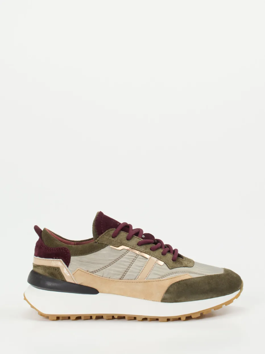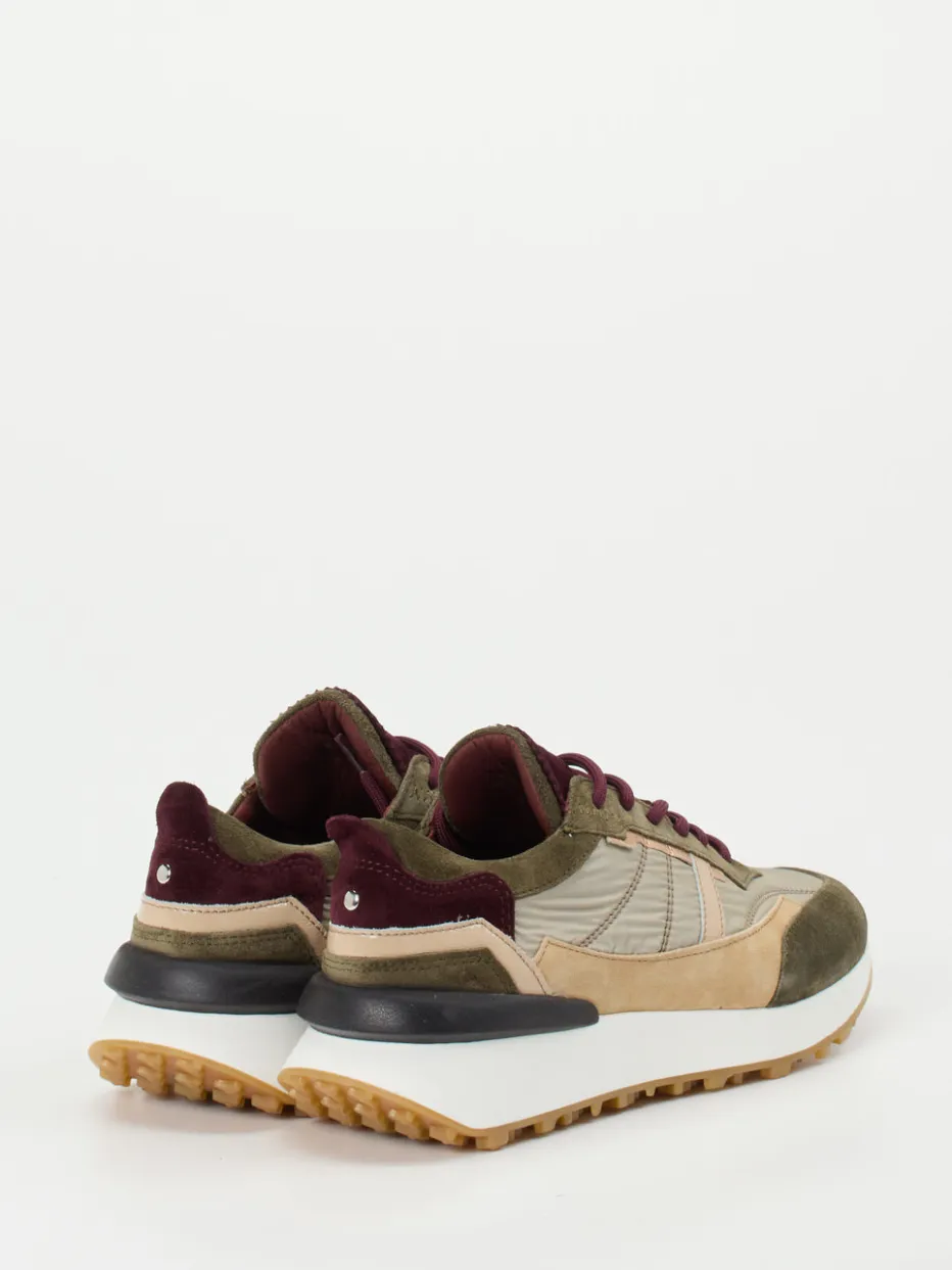 Mit spannender Oliv-Weinrot-Beige-Kombination und Metallic-Details interpretiert Piedi Nudi den Retro-Runner neu – modisch, komfortabel und mit urbanem Profil für sicheren Auftritt.