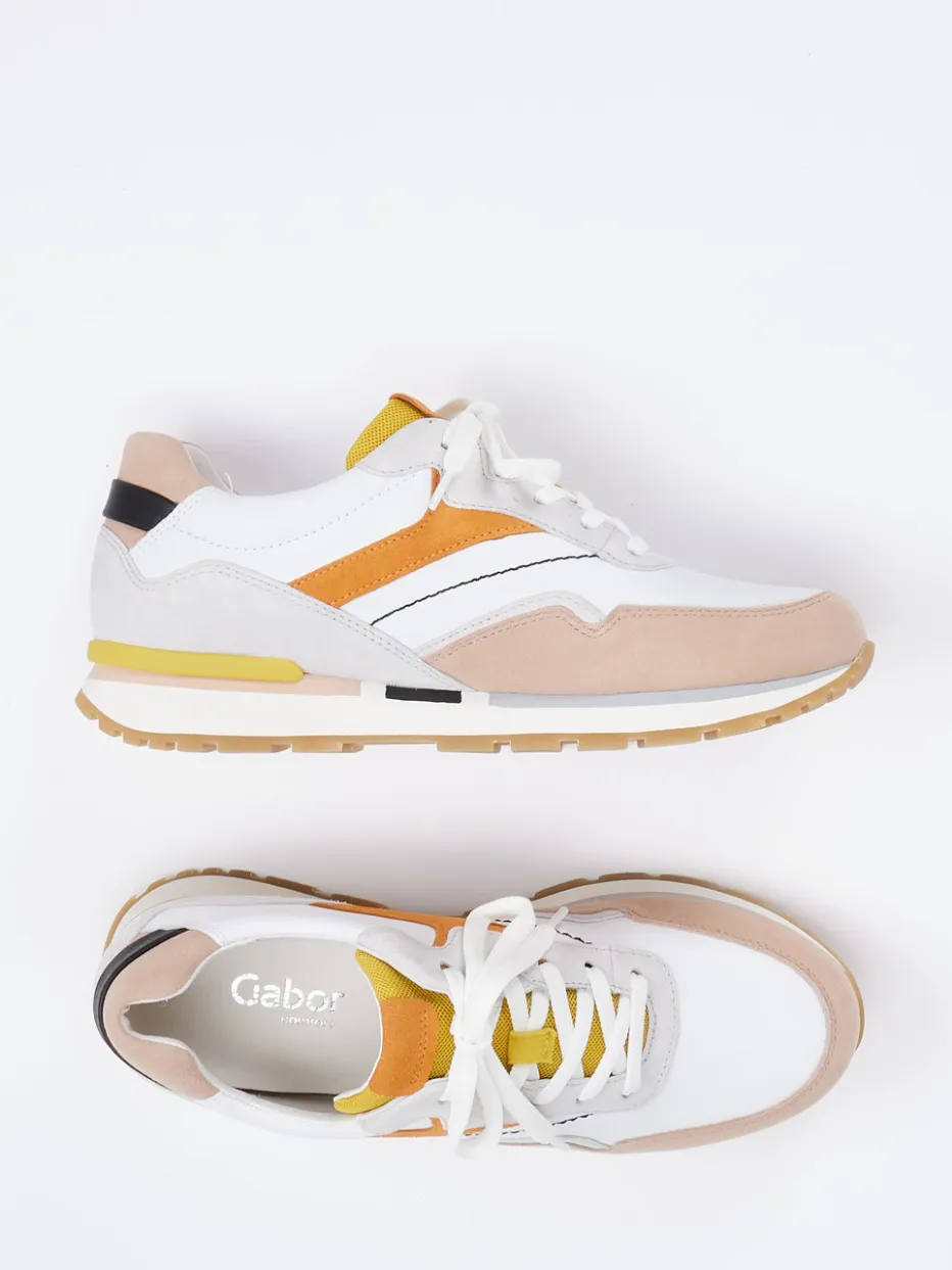 Für entspannte Outfits mit Stil.Gabor Comfort präsentiert in der Kategorie Sneaker ein Alltagsmodell im angesagten Retro-Look. Ideal für entspannte Stadtspaziergänge oder den Weg ins Café verbindet dieser Damen-Sneaker modische Raffinesse mit spürbarem Komfort. Hochwertiges Veloursleder trifft auf atmungsaktive Mesh-Einsätze und sorgt für ein charmantes Zusammenspiel aus Textur und Leichtigkeit. Die Farbwelt in Weiß mit Akzenten in Rosébeige, Senfgelb und Schwarz unterstreicht den Color-Blocking-Trend, während die sportliche Silhouette an klassische Laufschuhe erinnert. Eine profilierte Gummisohle gibt sicheren Grip, das Innenfutter aus Leder und Textil bietet angenehmen Tragekomfort. Perfekt zu Pastell-Jogpants oder hellen Jeans. Gabor Comfort steht für bequeme Passform mit trendbewusster Ästhetik.