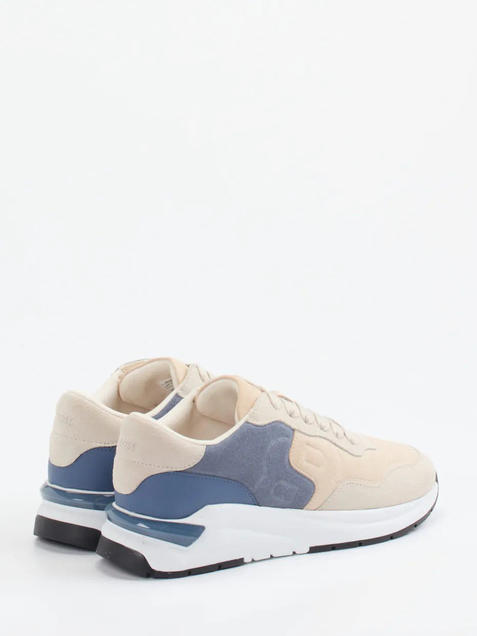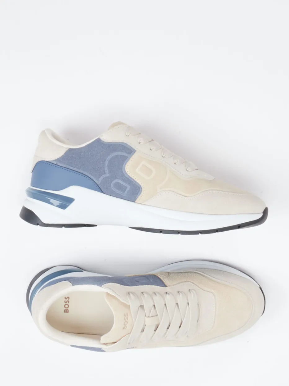 Soft-Neutrals trifft Retro-Silhouette.Die Marke Boss präsentiert einen Sneaker im Retro-Runner-Stil für Freizeit und Streetstyle. Ob beim Stadtbummel oder im urbanen Alltag – das Modell verbindet beiges und blaugraues Veloursleder mit samtig-matter Textur zu einem ausgewogenen Farbspiel. Ein glänzendes TPU-Element an der Ferse, seitliche Logo-Prägungen und eine dynamisch geschwungene Gummisohle mit starker Profilierung runden das Design sportiv ab. Die gepolsterte Ferse und ein herausnehmbares Komfort-Fußbett bieten spürbare Bequemlichkeit bei jedem Schritt. Der Look greift den Soft-Neutrals-Trend auf und lässt sich mühelos mit Jogpants oder Hoodie kombinieren. Markentypisch komfortabel, stilbewusst und alltagsnah.