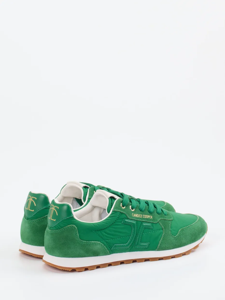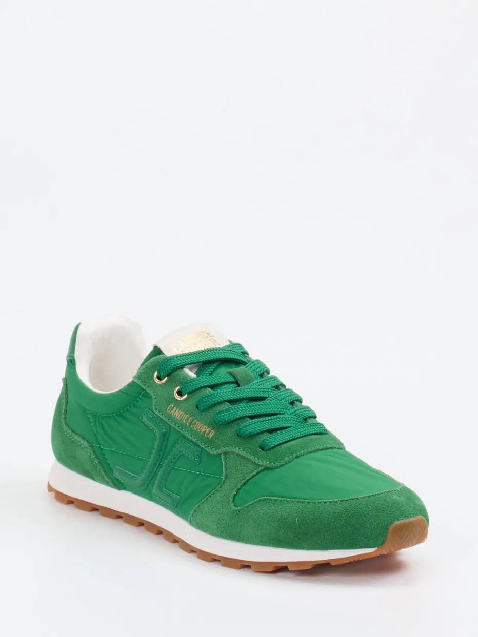 Frischer Look mit Retro-Spirit.Candice Cooper bringt sportlich-elegante Damen-Sneaker mit Retro-Vibes auf die Straße. Ideal für sonnige Tage im Park oder City-Touren – dieser grüne Sneaker überzeugt durch einen Materialmix aus samtig angeschliffenem Veloursleder und leichtem Nylon. Die flache, schmale Silhouette wird durch weiße Lederdetails und eine weiße Gummisohle mit honigfarbenem Profil ergänzt. Goldfarbene Logodetails und das dezente Grille-Emblem verleihen dem Design eine exklusive Note. Die profilierte Laufsohle sorgt für guten Grip, während das hochwertige Lederfutter mit Wechselfußbett täglichen Komfort garantiert. Besonders wirkungsvoll zu weißen Socken oder hellen Freizeitjacken. Exklusives Design trifft auf sommerliche Alltagstauglichkeit.