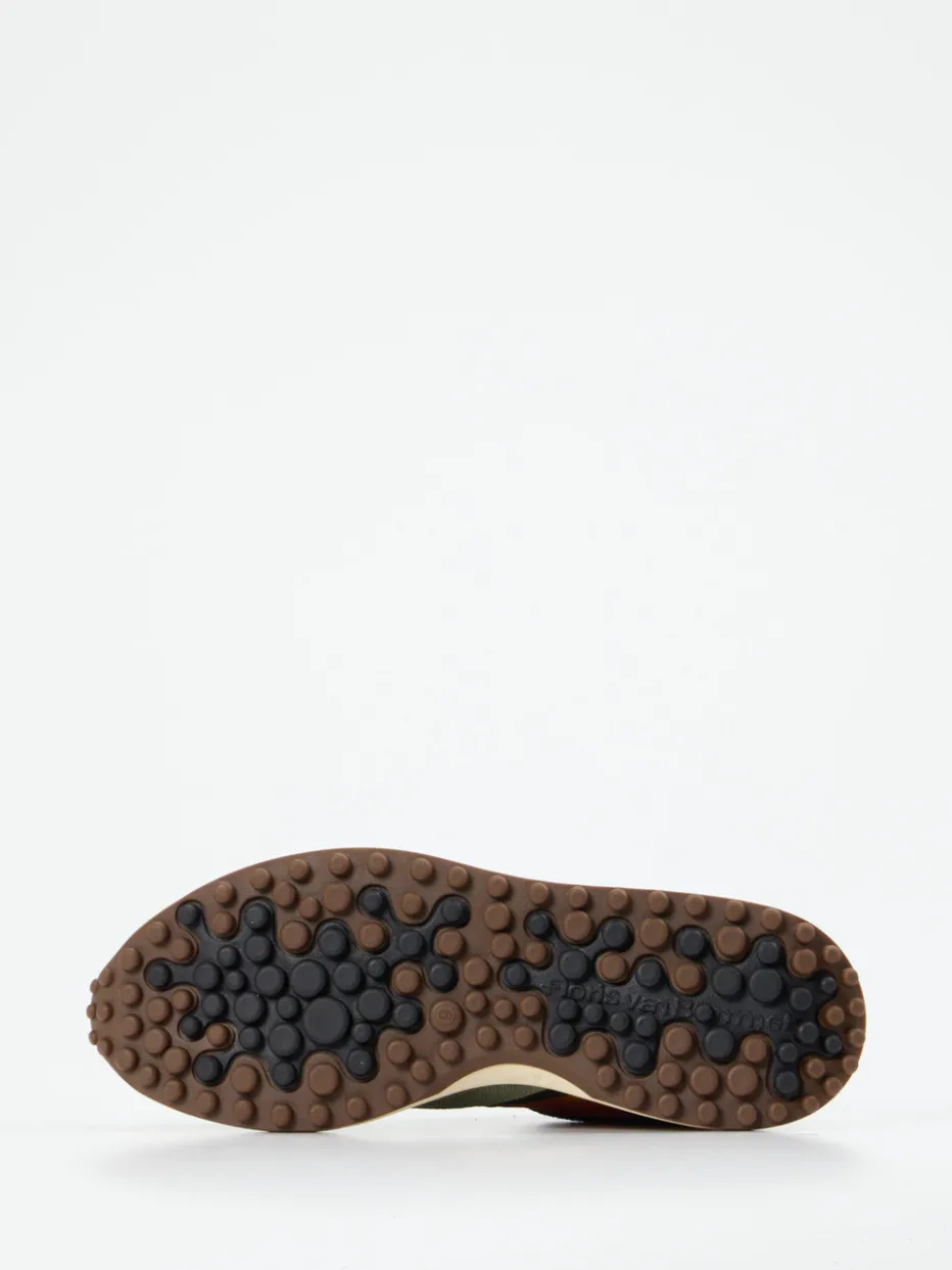 Gorpcore trifft modernes Color-Blocking.Floris van Bommel präsentiert mit diesem Herren-Sneaker einen markant gestalteten Vertreter der Retro-Runner. Ideal für urbane Spaziergänge oder den Wochenendausflug: Die Kombination aus samtig angeschliffenem Veloursleder, glattem Kalbleder und luftigem Mesh sorgt für strukturellen Reiz und optimale Atmungsaktivität. Olivgrün bildet die Basis für die kraftvolle Farbkombination mit Rostbraun, Marineblau und Schwarz – vereint durch reflektierende Details und Kontrastbesätze. Die gepolsterte Schaftpartie und das austauschbare Lederfußbett bieten Komfort, die markante Gummisohle mit Outdoor-Profil verleiht Stabilität. Ihr Stil bewegt sich sicher zwischen Streetwear und Gorpcore-Trend. Ein anspruchsvoller Sneaker mit funktionalen und optischen Highlights.