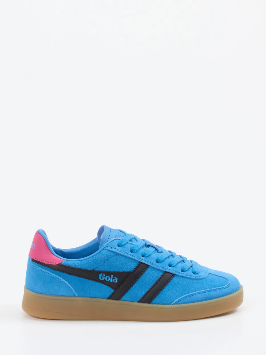 Farbe trifft auf Retro-DNA.Gola liefert mit diesem Retro-Sneaker ein stylishes Unisex-Modell für modebewusste Freizeitmomente. Das samtig-weiche Veloursleder in Kornblumenblau wird durch pinke Akzente an der Ferse und schwarze Seitenstreifen mit Logo dynamisch kontrastiert. Die flache, profilierte Gummisohle bietet Komfort und Griffigkeit, während die gepolsterte Einstiegspartie und die klassische Schnürung für perfekten Sitz sorgen. Inspiriert vom Vintage-Stil der 90er verschmilzt dieses Modell Streetwear-Charme mit Color-Blocking-Aesthetics. Besonders wirkungsvoll mit weißen Sportsocken oder einer Y2K-Crossbody-Bag zu kombinieren. Ein markanter Sneaker mit urbaner Energie und britischer Sportswear-Tradition.