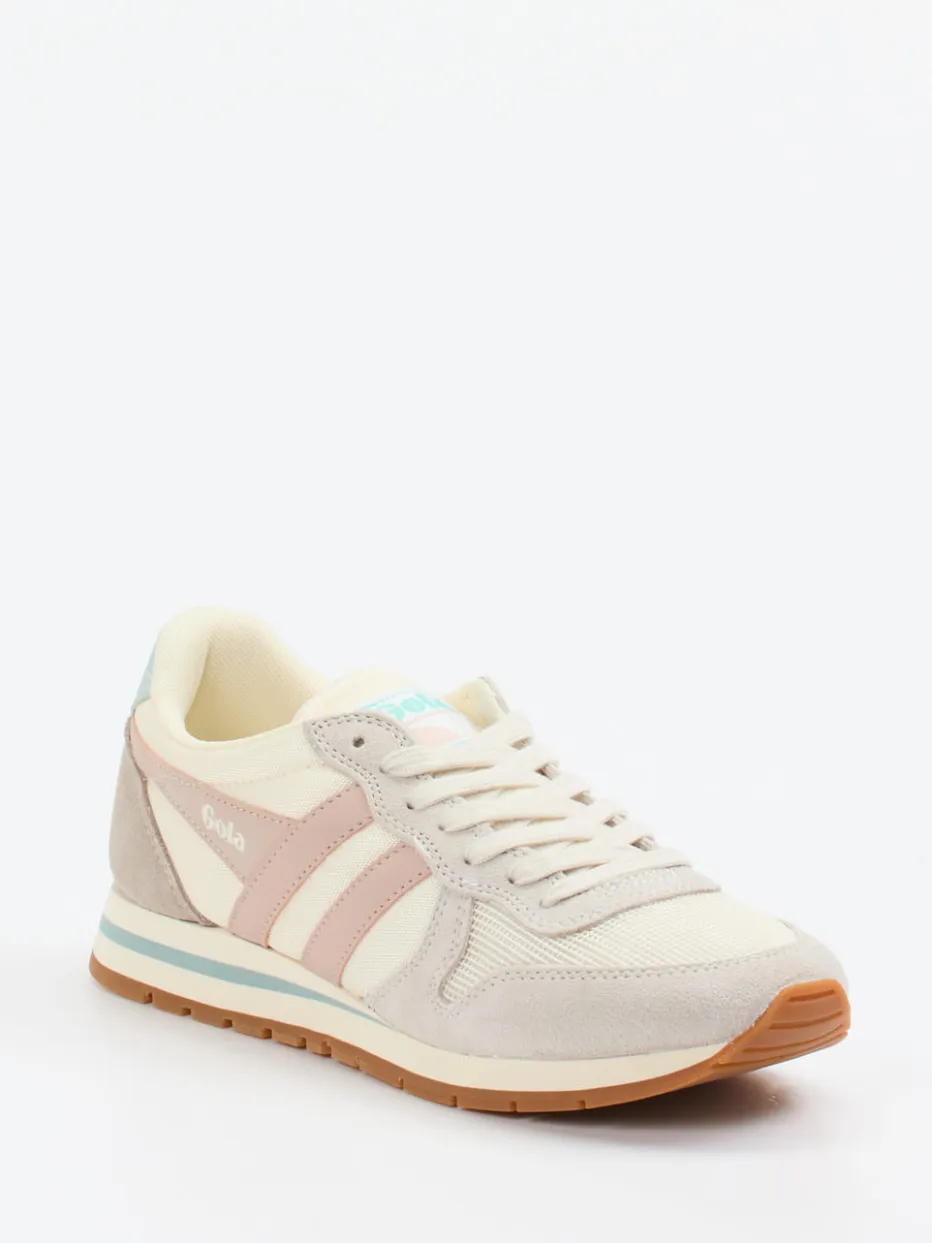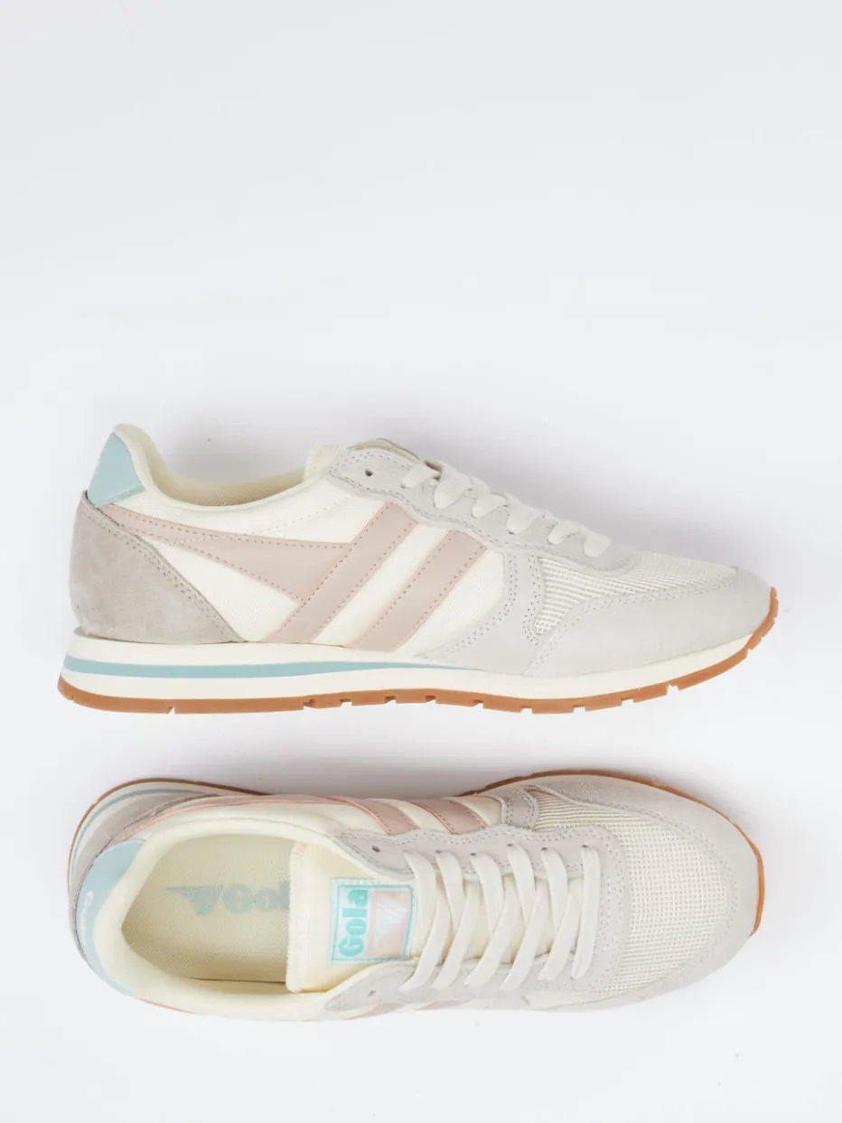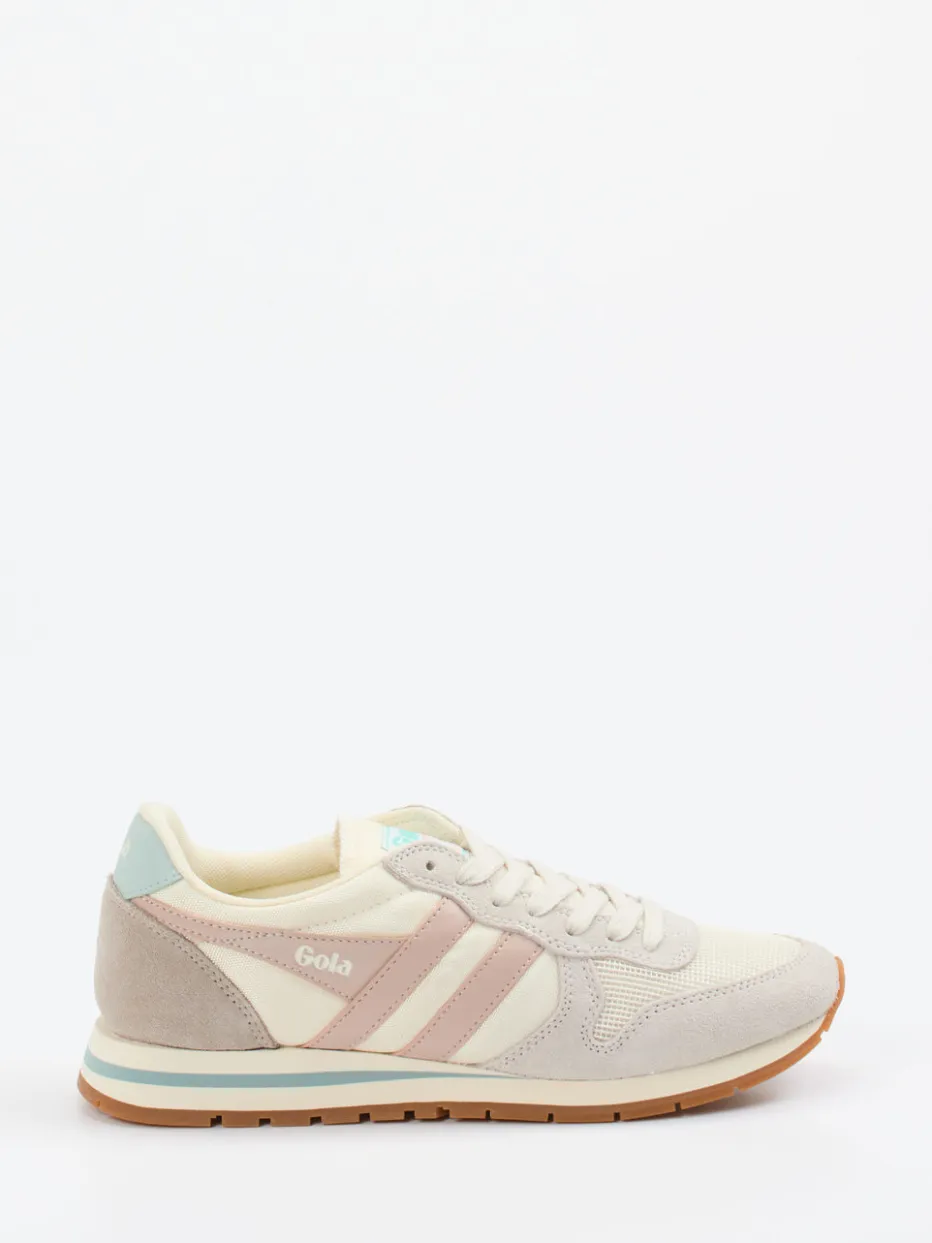 Pastell trifft Retro.Gola interpretiert den klassischen Damen-Sneaker neu. Die sportlich-flache Silhouette greift stilprägende 90s-Vibes auf und bringt sie, kombiniert mit zarten Trendfarben, in die Gegenwart. Dieser Sneaker aus Veloursleder, ergänzt mit matt strukturiertem Mesh, setzt mit seinem harmonischen Mix aus Cremeweiß, Rosébeige und Pastellblau Akzente. Details wie Logo-Prints, ein gepolsterter Schaft und die griffige Gummisohle unterstreichen den Streetwear-Charakter. Ideal für urbane Freizeitlooks von Frühling bis Sommer. Gut kombinierbar mit soften Jogpants oder luftigen Alltags-Outfits. Ein vielseitiger Trend-Sneaker mit Stilbewusstsein und Komfortanspruch.