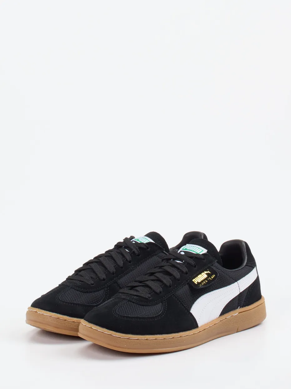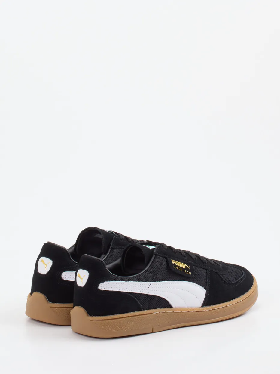Inspiriert vom Hallensport der 90er.Puma interpretiert den Retro-Sneaker neu: Dieser schwarze Unisex-Schuh kombiniert samtiges Veloursleder mit atmungsaktivem Mesh und einer markanten Gum-Sohle. Ideal für urbanen Alltag und Freizeit bietet das Modell mit flacher Silhouette, sportlicher Schnürung sowie auffälligen Kontraststreifen und goldfarbenem Markenlogo einen authentisch-vintage Look. Die profilierte Gummisohle sorgt für rutschhemmenden Komfort und robusten Halt. Als Streetwear-Highlight perfekt kombinierbar mit Trainingsjacke oder cropped Jeans. Ein Sneaker mit Kultpotenzial – sportiv, trendorientiert und klar im Look von Puma.