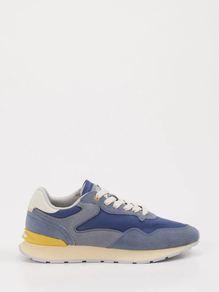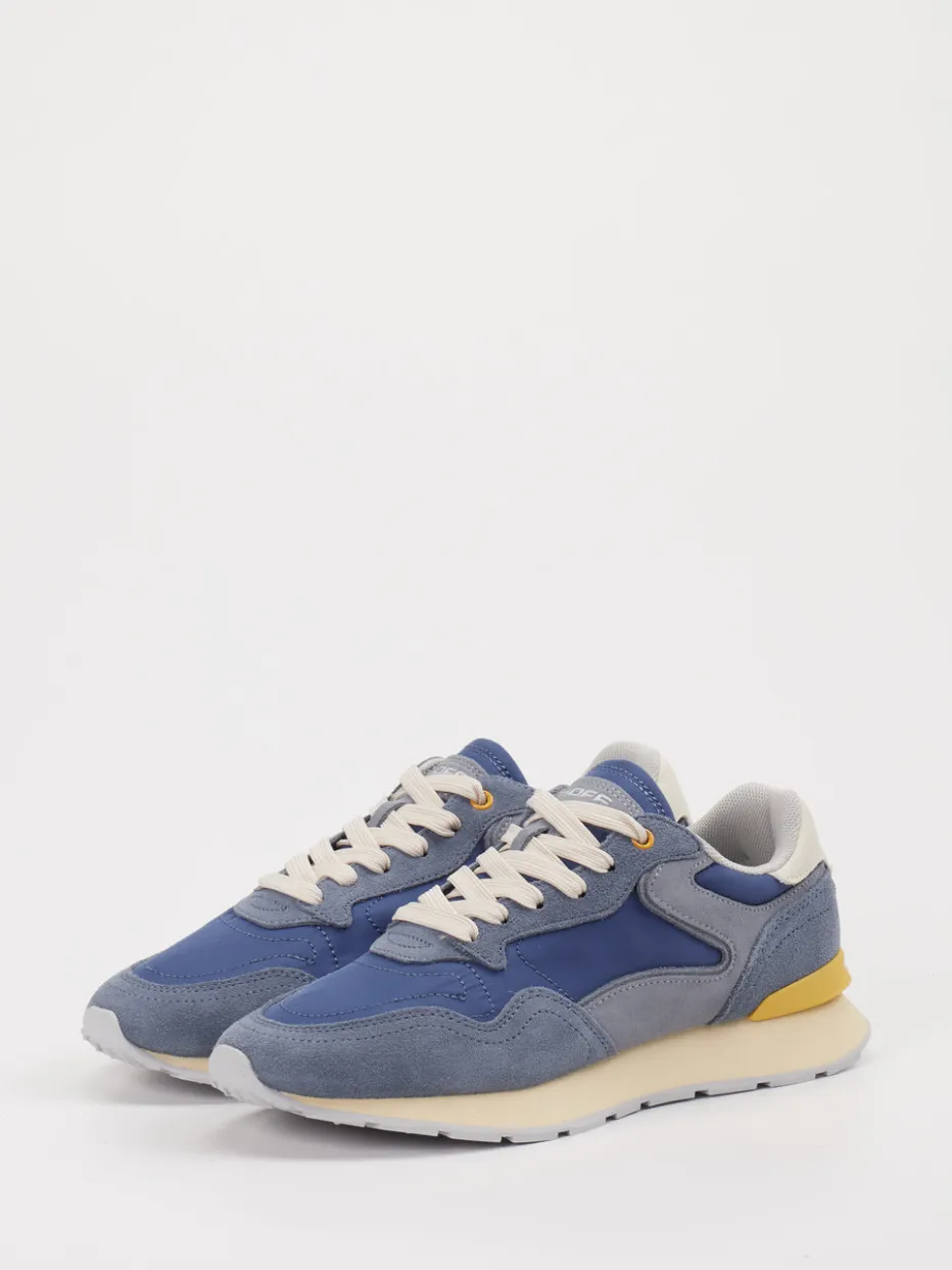 Streetstyle trifft auf Retro-Charme. THE HOFF BRAND interpretiert den klassischen Runner als urbanen Sneaker mit nostalgischem Spirit. Ideal für stylishe City-Walks: Die Kombination aus blauem Veloursleder und atmungsaktivem Textilmesh sorgt für angenehmen Tragekomfort. Der niedrig geschnittene Schaft, die gepolsterten Partien und kontrastierende Details wie die senfgelbe Fersenkappe und Logo-Prints unterstreichen die Vintage-Optik. Eine stabile Gummisohle und das mehrteilige Profil bieten sicheren Stand im Alltag. Der Look passt perfekt zu Joggerpants oder Cargo-Jeans. Ein sportlich-trendiger City-Allrounder mit charakterstarkem Designanspruch.