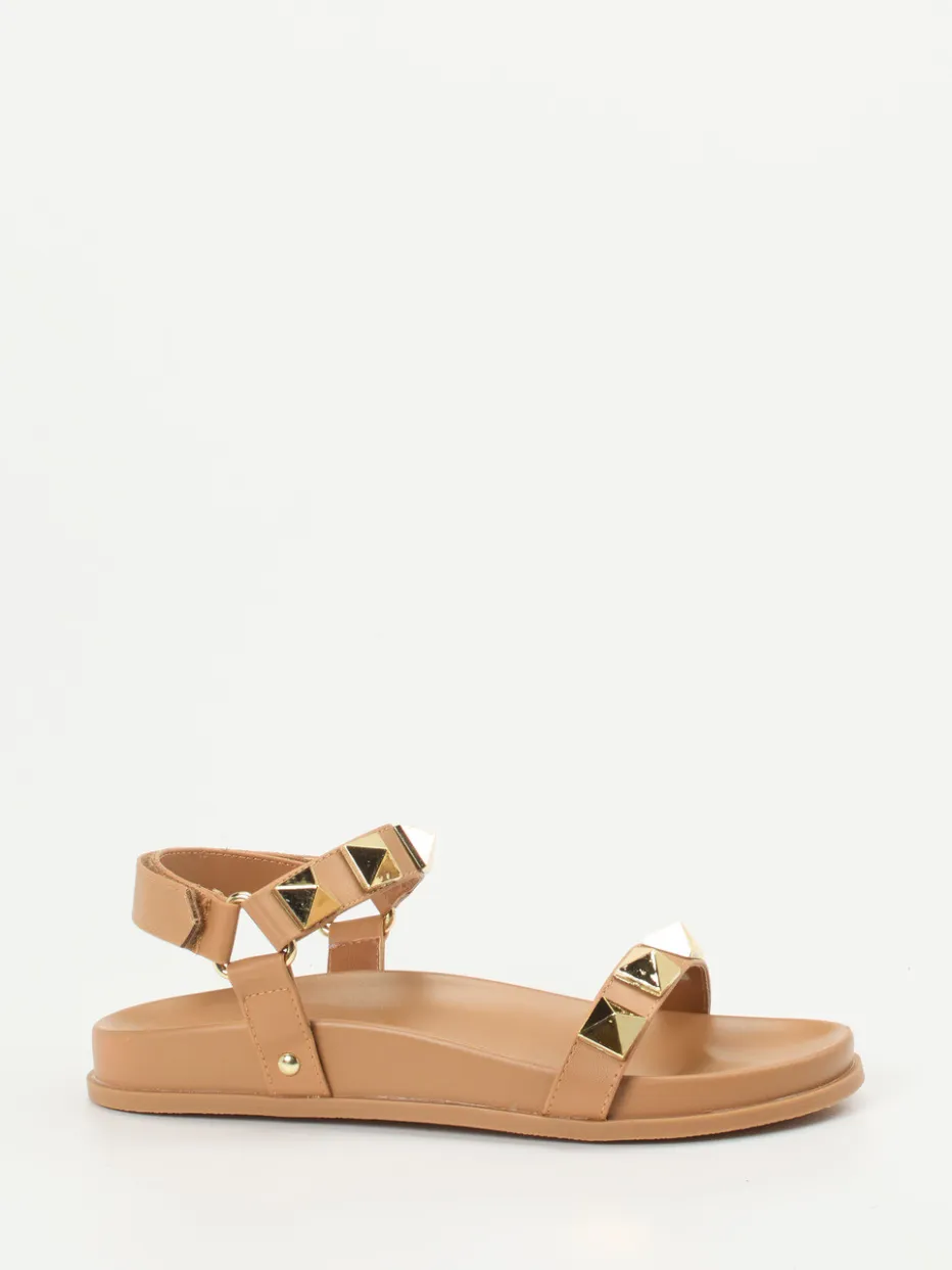 Sommerlich leicht und mit goldfarbenen Nieten veredelt: Diese Riemchensandale verbindet anspruchsvolle Streetwear mit alltagstauglichem Komfort.