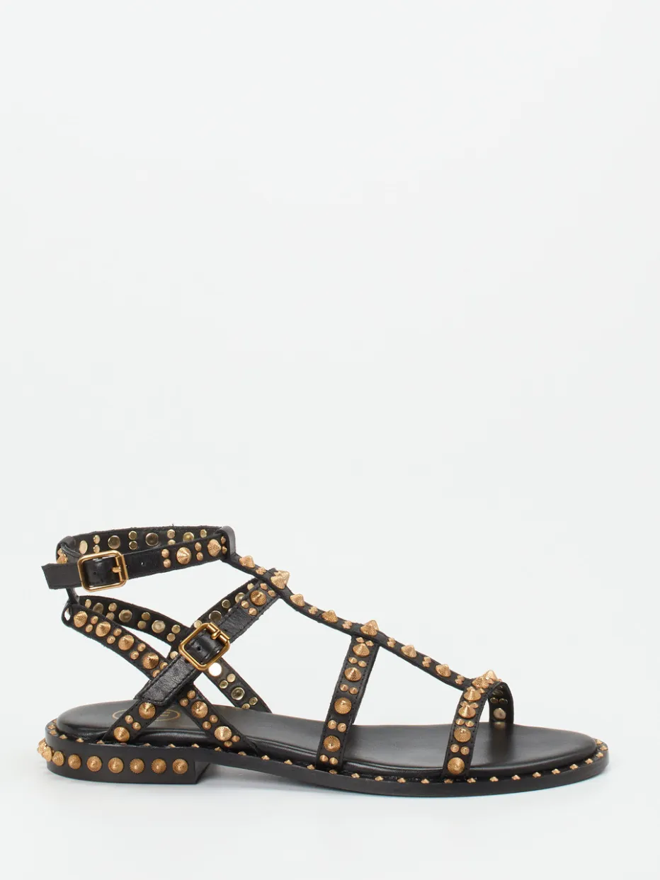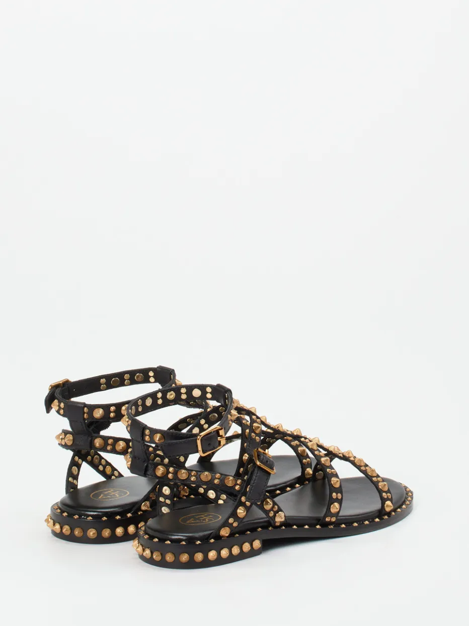 Statement-Sandale für starke Looks.ASH präsentiert mit dieser Damen-Riemchensandale ein markantes Modell im sommerlichen Stil. Ideal für Festivals, Partynächte oder urbane Spaziergänge: Das hochwertige Kalbleder überzeugt durch glatte, matte Oberfläche und eine gepolsterte Innensohle für angenehmen Tragekomfort. Schwarze Silhouette, flache Form und goldfarbene Metallnieten betonen den angesagten Gladiator-Look. Zwei filigrane Schnallenriemen um Spann und Knöchel sorgen für sicheren Halt. Die elegante Ledersohle mit Logo komplettiert den rockig-glamourösen Stil, der sowohl zu Sommerkleid als auch zur Lederclutch passt. Design trifft Komfort – ASH interpretiert urbanen Chic mit handwerklicher Raffinesse.