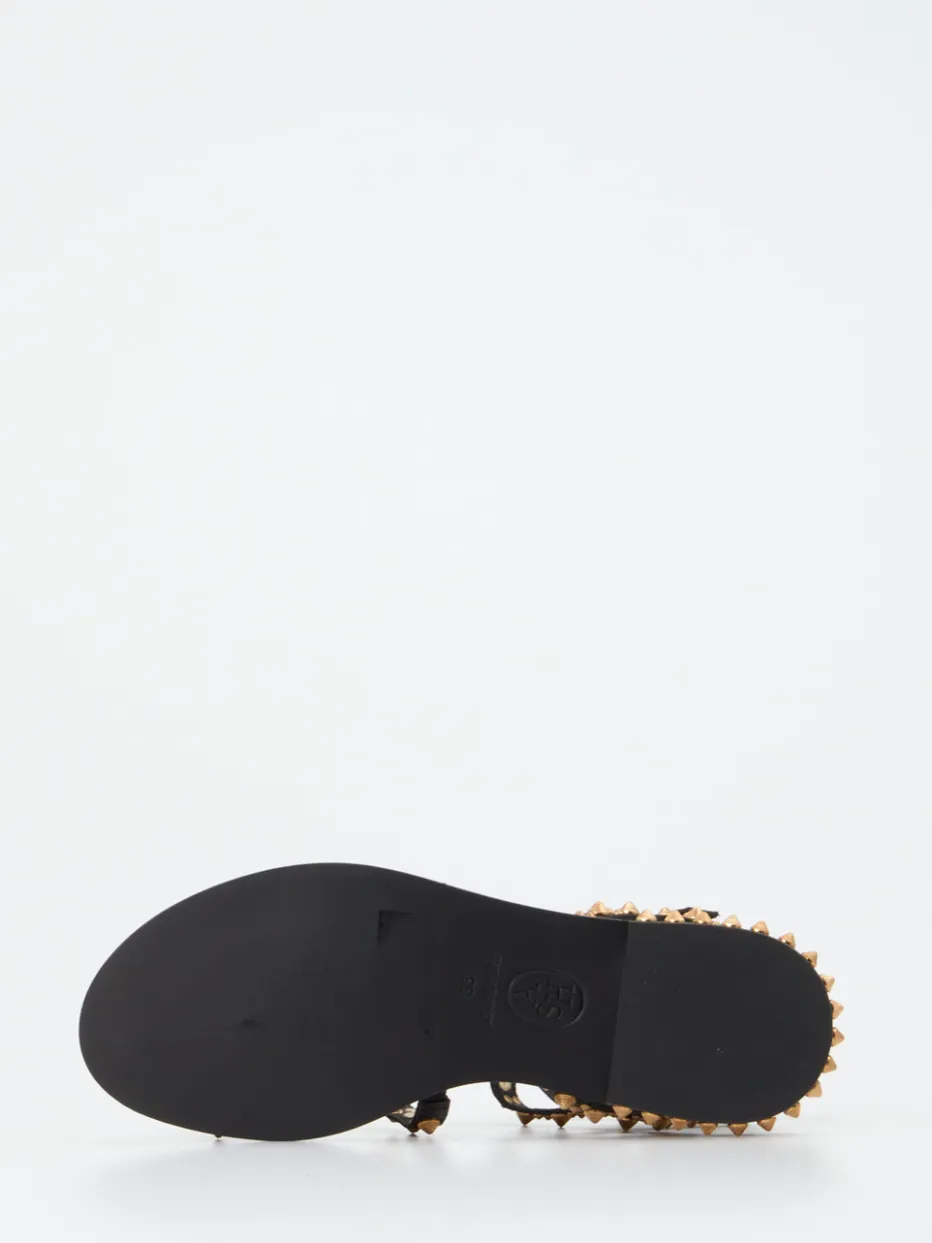Diese schwarze Riemchensandale kombiniert feines Kalbleder mit goldfarbenen Nieten für einen kraftvollen Auftritt – stilvoll und urban zugleich.
