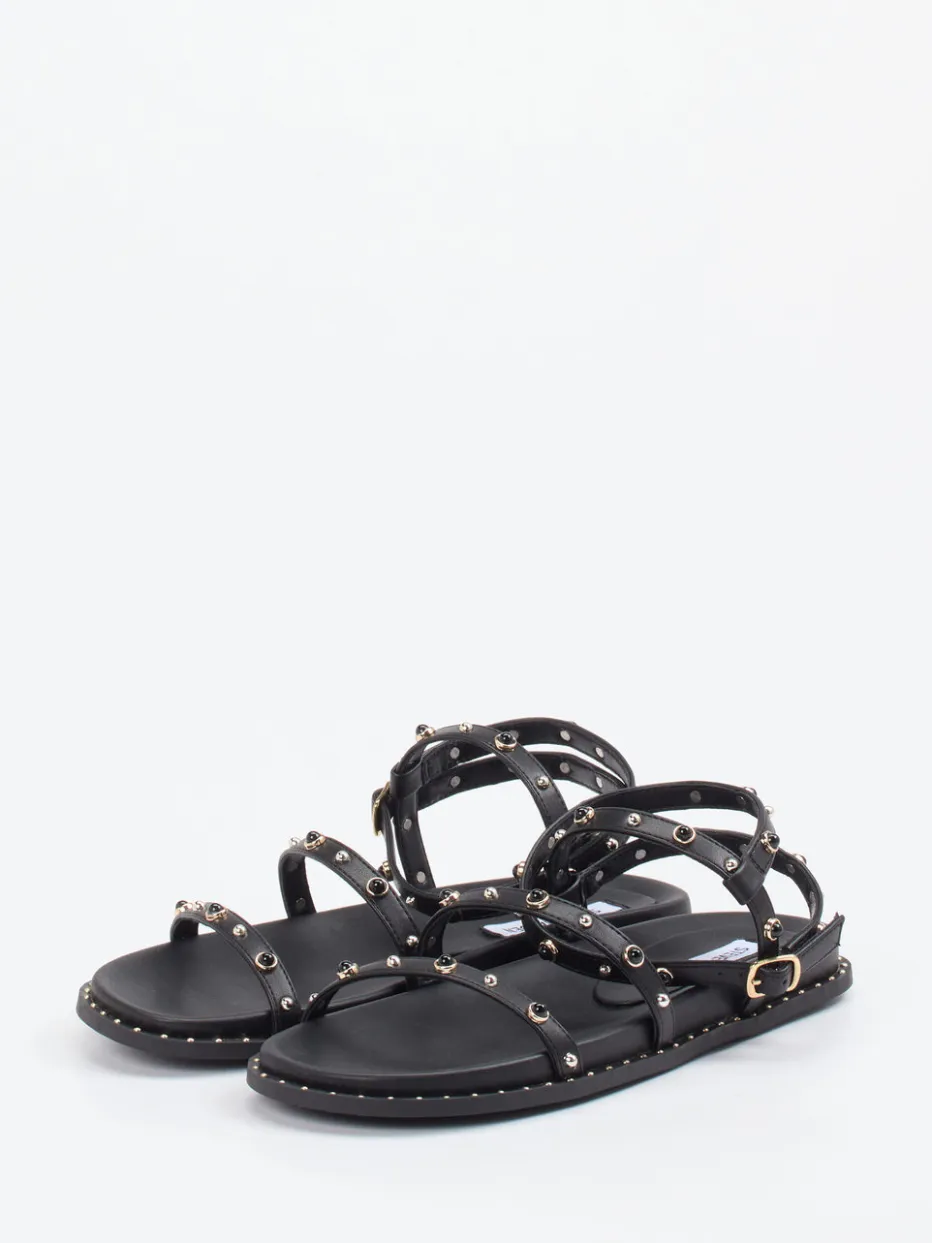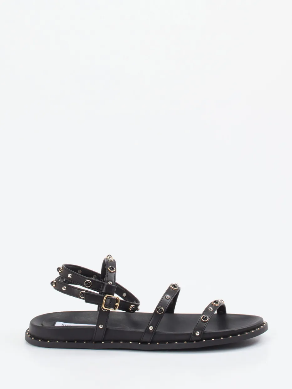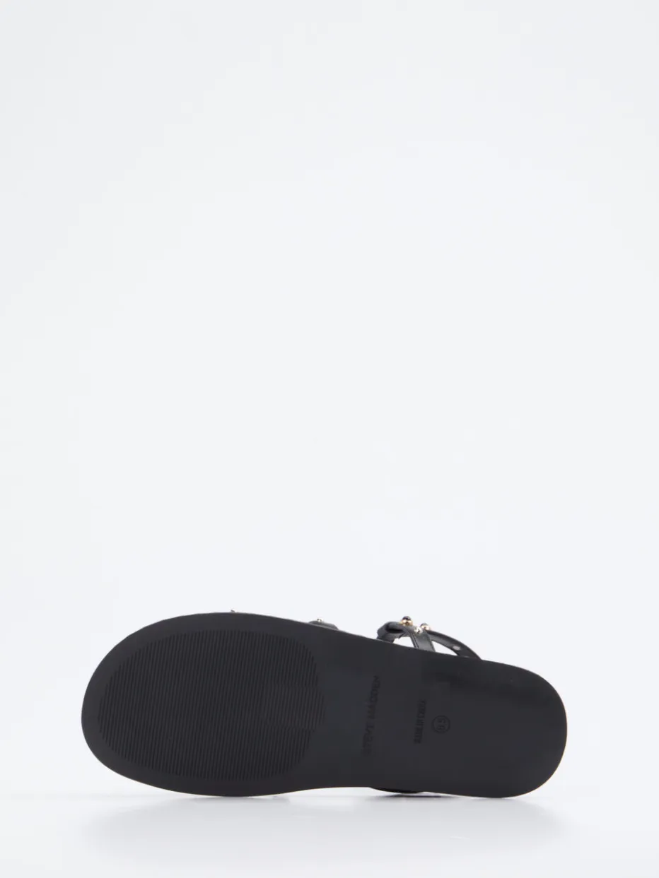 Mit ihrer flachen Silhouette und edlen Nietenoptik vereint diese Sandale urbanen Minimalismus mit femininer Raffinesse – ideal für stilbewusste Sommerlooks.