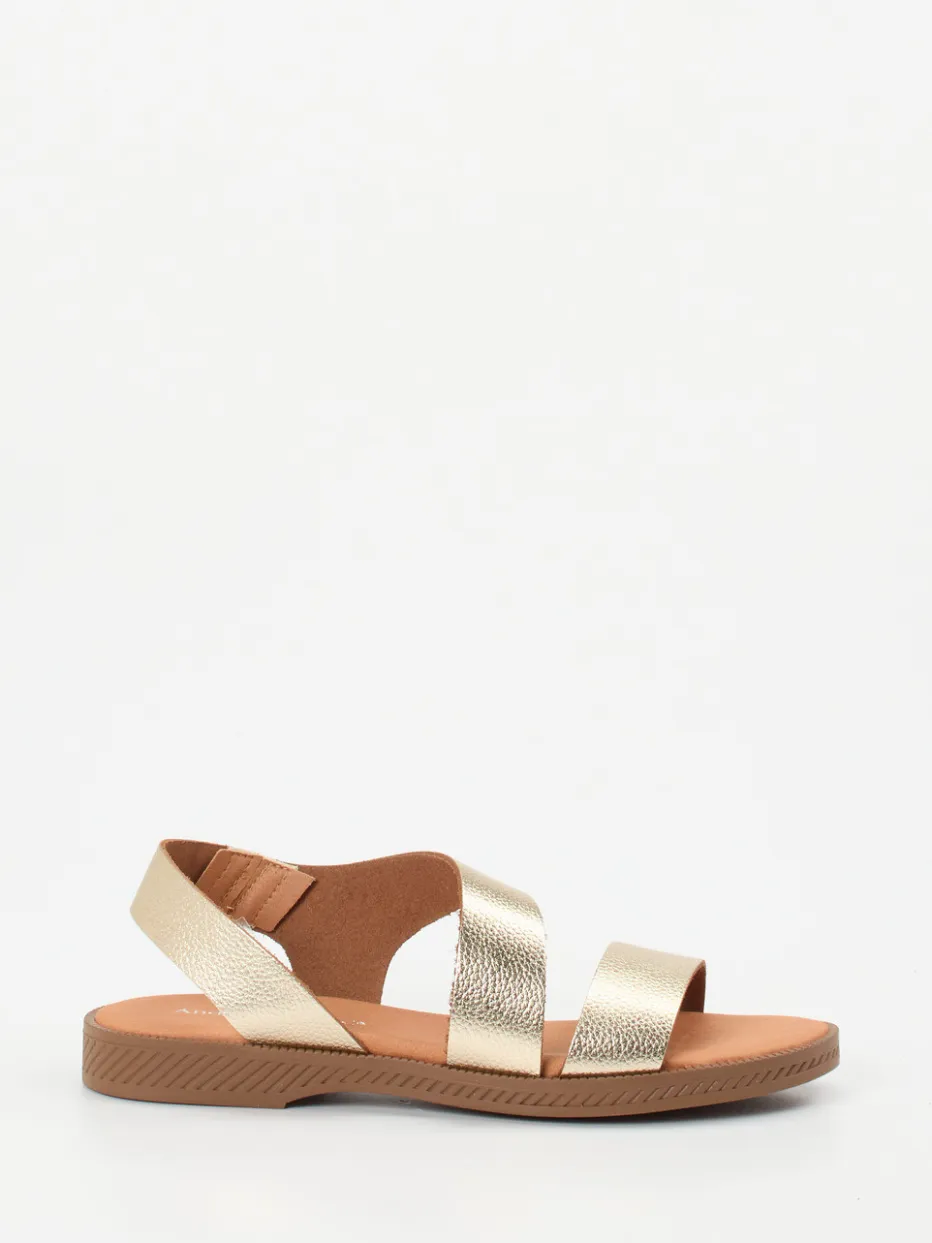Die elegante Riemchensandale kombiniert glänzendes Metallicleder mit einem elastischen Fersenriemen und sorgt so für sommerlichen Komfort mit modischer Leichtigkeit.