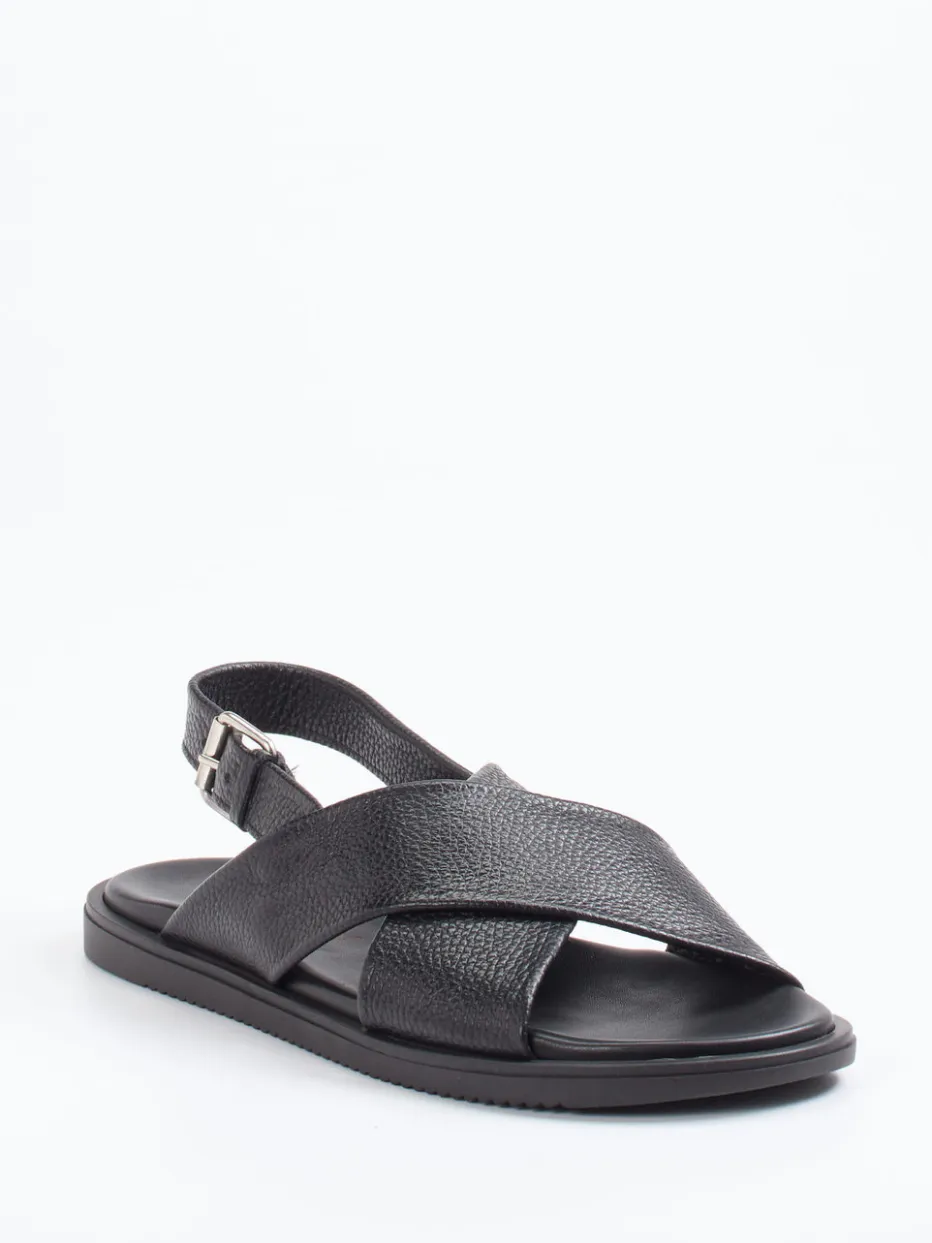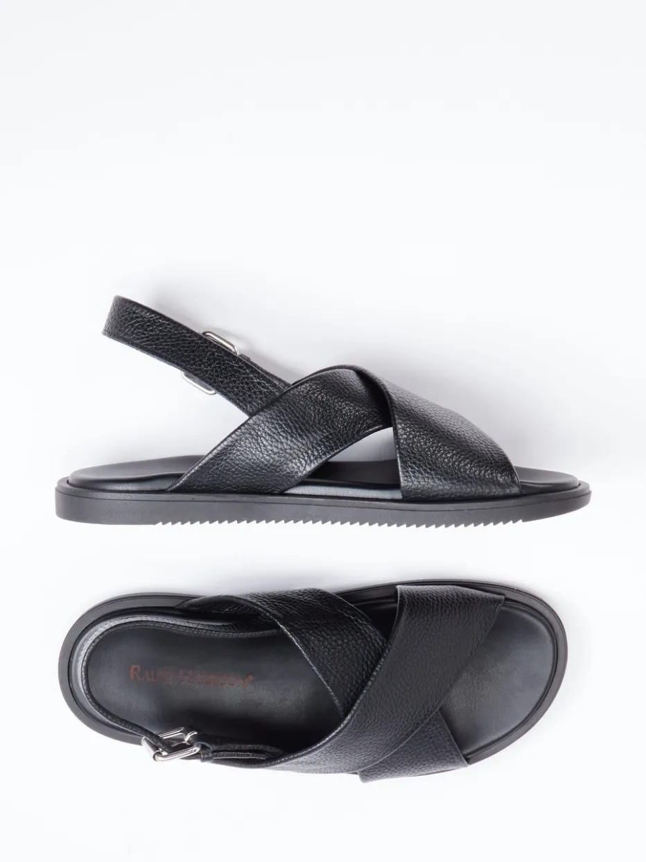 Sommerleicht und stilsicher.Ralph Harrison präsentiert eine puristische Riemensandale für Herren. Ob in der Stadt oder auf Reisen – diese offen gestaltete Sandale mit flacher Silhouette erfüllt höchste Ansprüche an Tragekomfort und Stil. Hochwertiges Kalbleder mit naturbelassener Narbung trifft auf breitere, gekreuzte Riemen und eine individuell verstellbare Fersenschnalle in Silberoptik. Die gepolsterte Lederdecksohle und die profilierte Gummisohle garantieren langanhaltende Bequemlichkeit und sicheren Tritt. In tiefem Schwarz gehalten, passt das Modell ideal zu Leinenhosen oder Shorts in gedeckten Tönen. Trendbewusst positioniert im Segment „Quiet Luxury“. Premiumkomfort mit zeitloser Eleganz für moderne Herrenfüße.