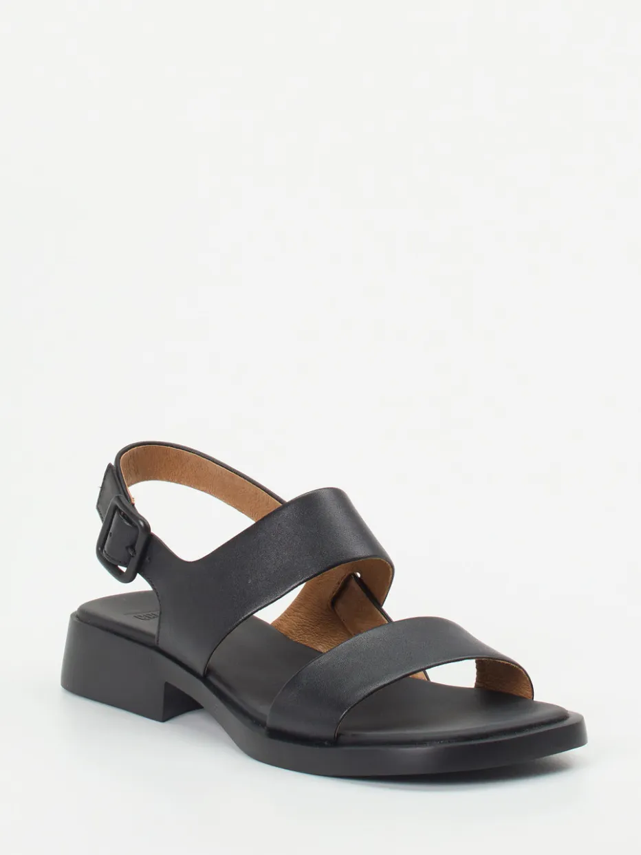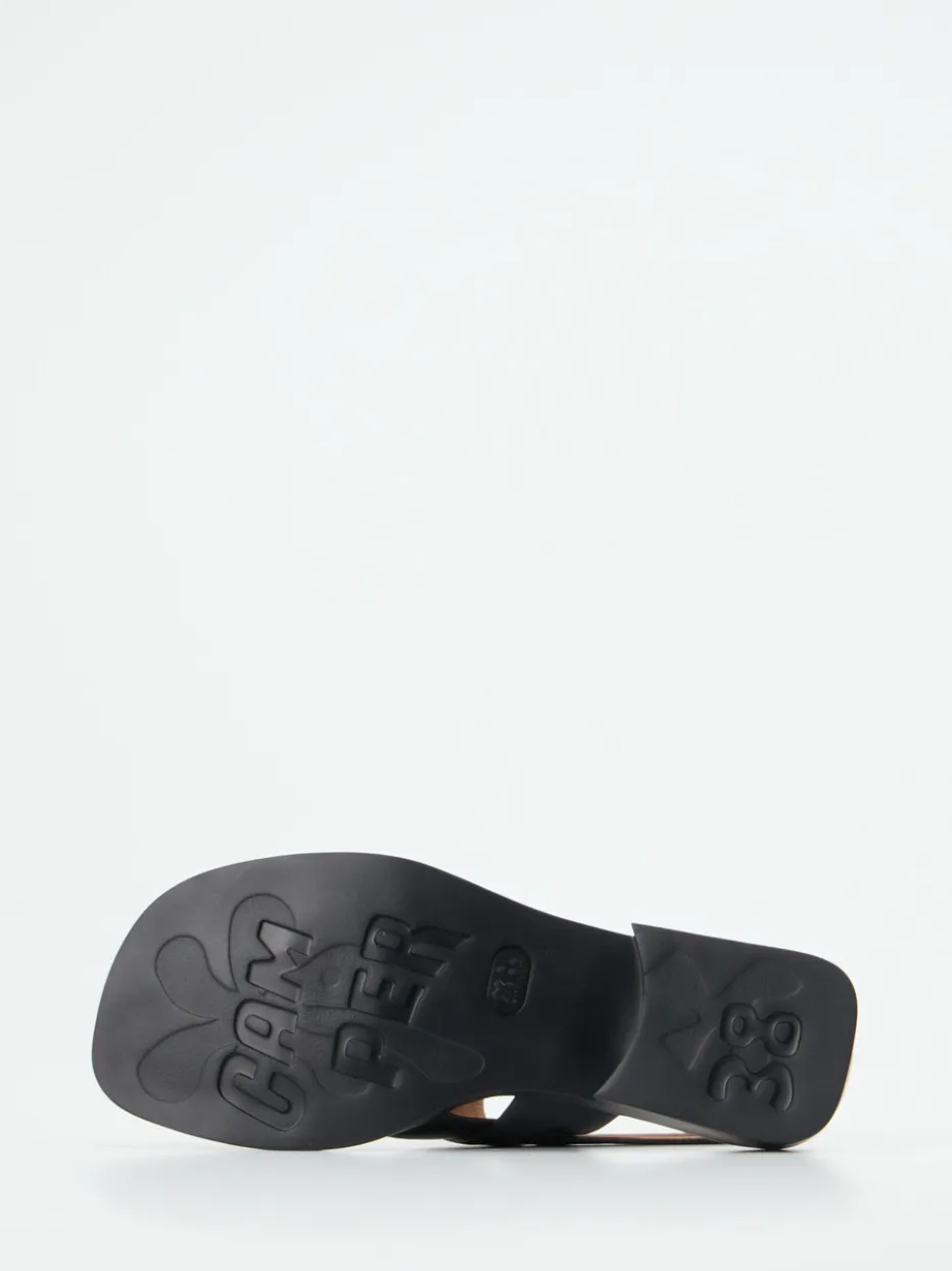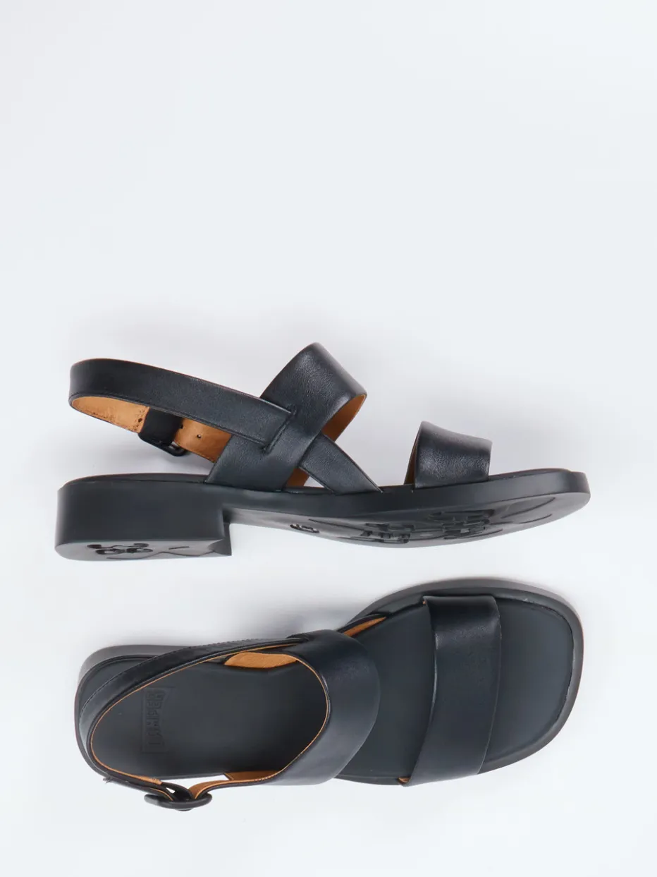 Minimalistisches Statement aus Leder.Die Marke Camper präsentiert mit dieser Riemensandale ein modernes Essential für Frühling und Sommer. Ideal für urbane Streifzüge oder entspannte Urlaubstage: Gefertigt aus geschmeidigem Lammleder mit matter Oberfläche, zeigt sich die schwarze Sandalette mit breiten Quer-Riemen, verstellbarem Fersenriemen samt toniger Metallschnalle und gepolstertem Fußbett. Der flache Blockabsatz und die extraleichte Gummisohle sorgen für Komfort im Alltag. Der cognacfarbene Kontrast im Lederfutter verleiht eine stilvolle Tiefe. Der Look greift aktuelle „Quiet Luxury“-Tendenzen auf und passt hervorragend zu fließenden Sommerkleidern in Naturtönen. Zeitlose Formgebung trifft hochwertige Materialien – kompromisslos durchdacht von Camper.
