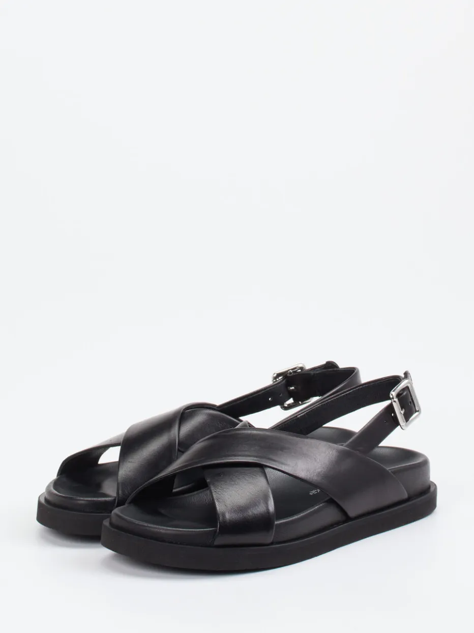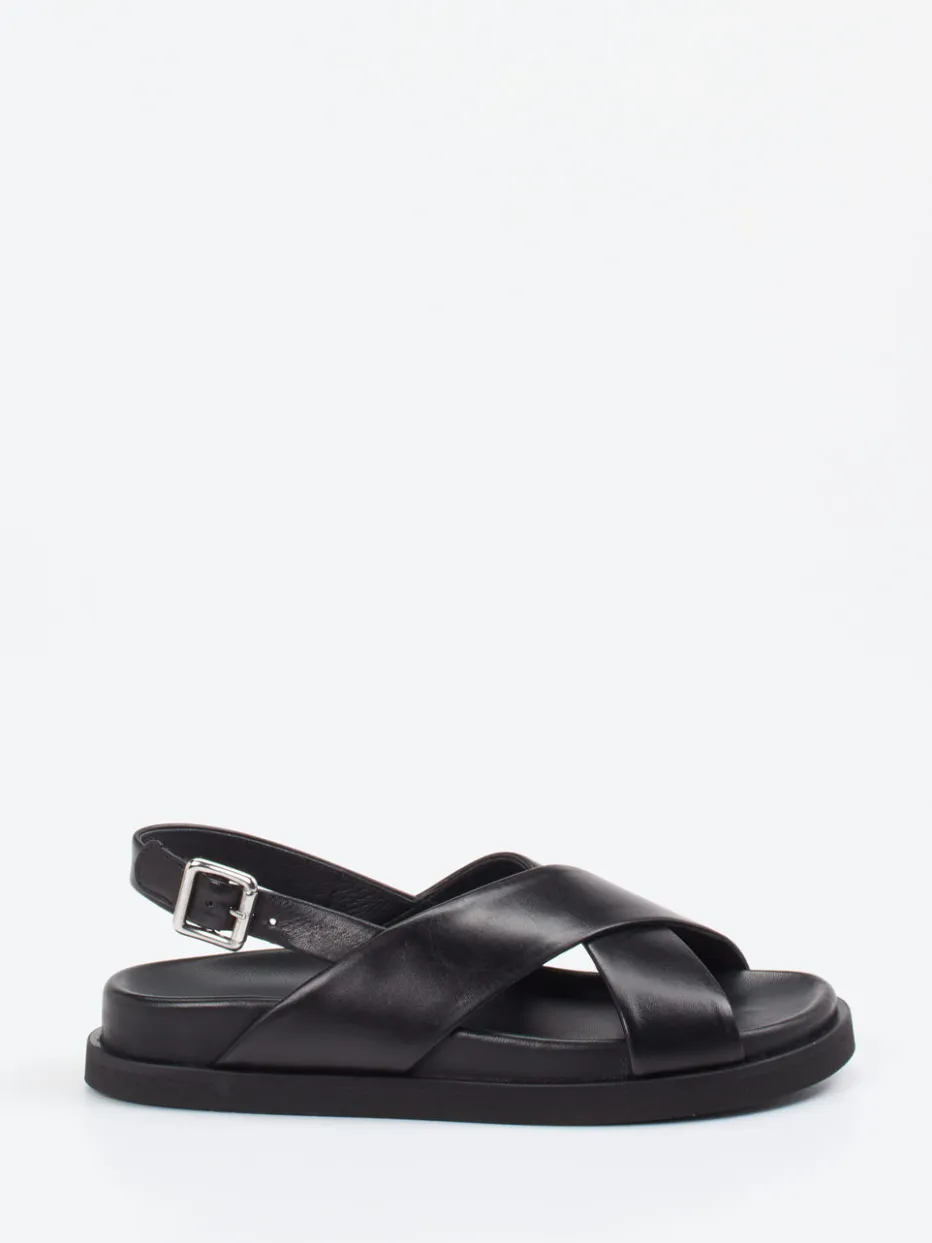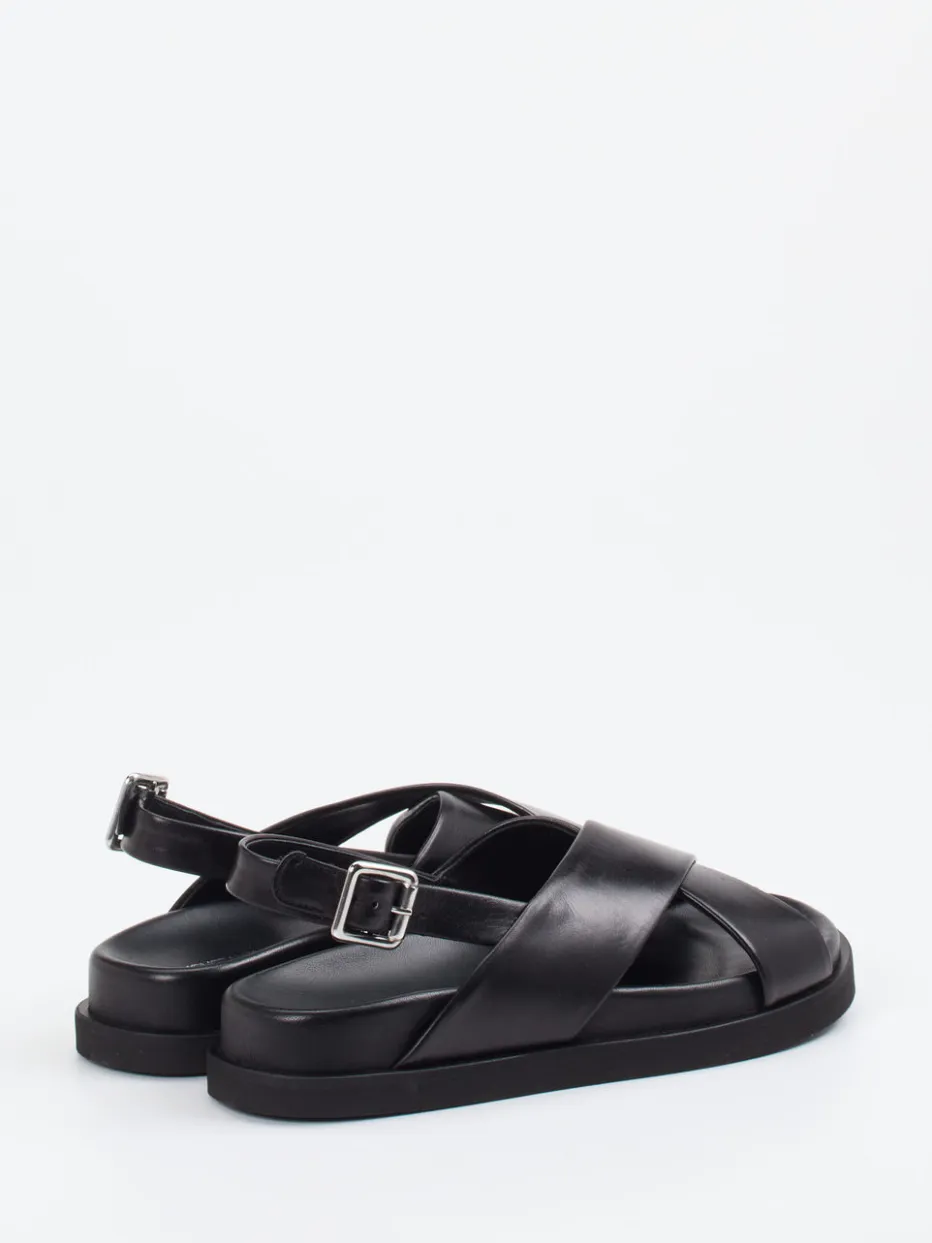 Ideal für Stadtspaziergänge oder entspannte Freizeitmomente bietet sie durch weich glänzendes schwarzes Lammleder und das gepolsterte Fußbett einen eleganten Look mit tollem Komfort. Die gekreuzten Vorderfußriemen und der verstellbare Fersenriemen mit silberfarbener Dornschließe sorgen für sicheren Halt. Eine flache Gummisohle unterstreicht den modernen, reduzierten Charakter. Als Teil des „Quiet Luxury“-Trends lässt sich das Modell ideal mit monochromen Sommer-Looks wie einer schwarzen Leinenhose kombinieren.