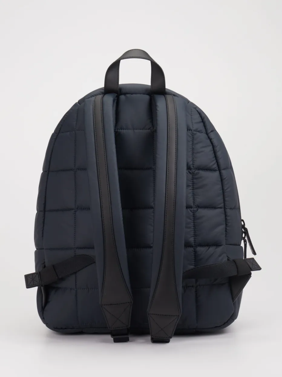 Minimalismus trifft Funktion. VeeCollective Berlin präsentiert mit diesem Rucksack einen leichten Daypack im urbanen Stil. Ideal für entspannte City-Tage oder den Weg ins Café: Der dunkelblaue Rucksack aus mattem Nylon kombiniert ein minimalistisches Design mit funktionalen Details wie einer Reißverschluss-Außentasche und einem Mesh-Innenfach. Die gepolsterten, individuell verstellbaren Schulterriemen mit Kunstlederdetails sorgen für angenehmen Tragekomfort. Die gesteppte Oberfläche im Karo-Look greift den Trend zu „Padded Accessories“ auf und verleiht ihm eine moderne Silhouette. Perfekt kombinierbar mit sportlich-urbanen Outfits oder Steppjacken. Ein funktionaler Alltagsbegleiter mit stilistisch ruhigem Auftreten – typisch VeeCollective Berlin.