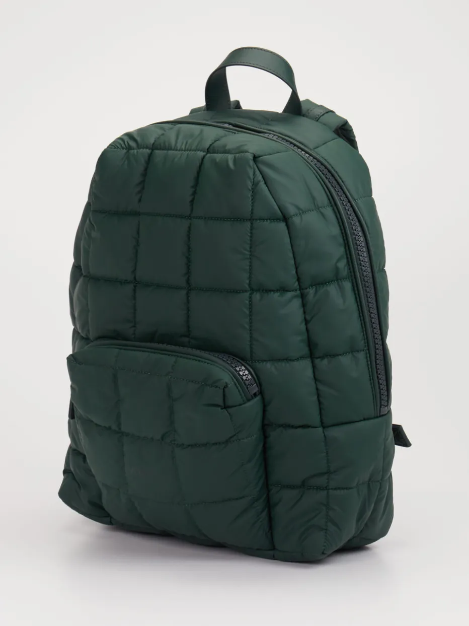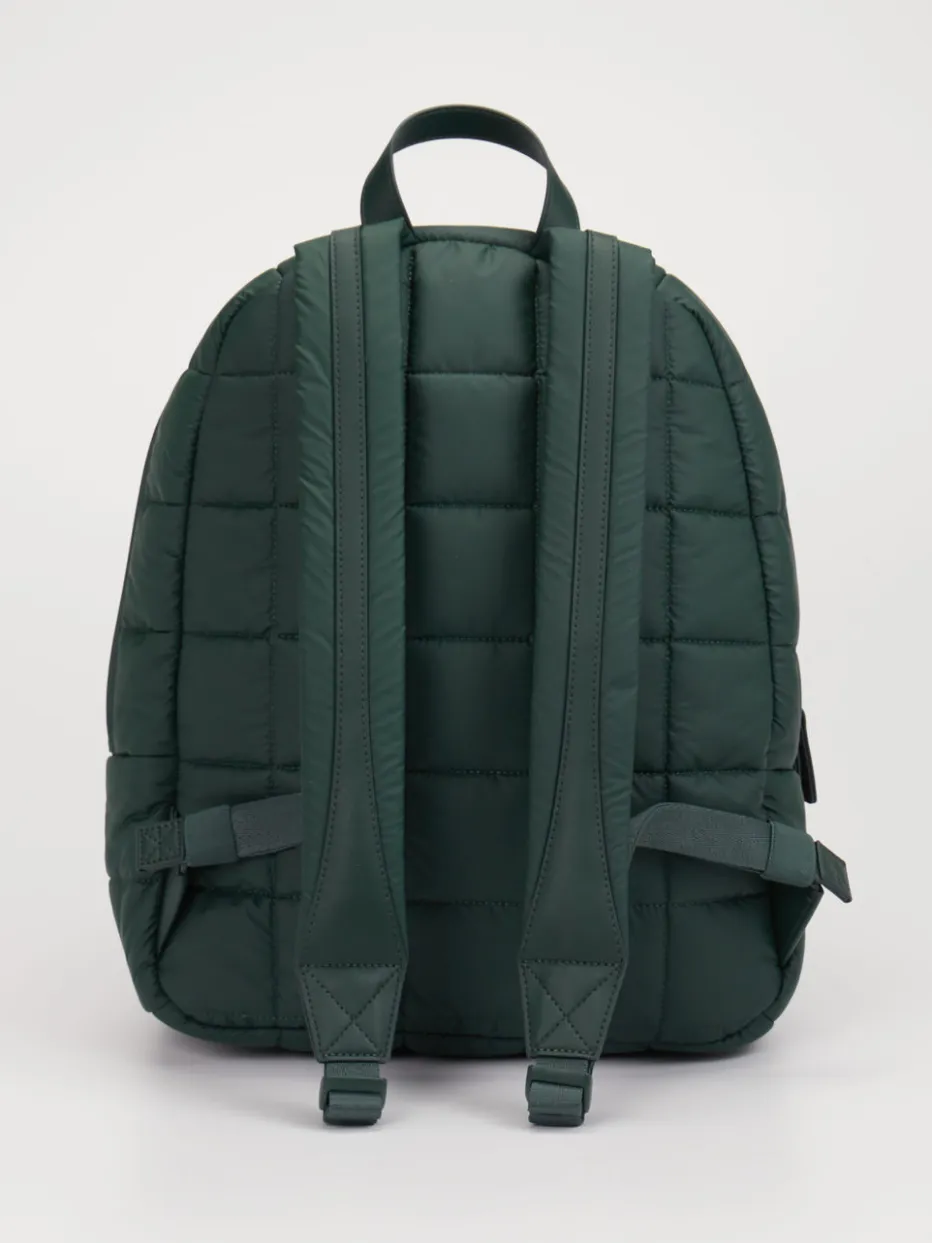 Gepolsterter Look für sorgenfreie Tage. VeeCollective Berlin präsentiert mit diesem veganen Rucksack ein modernes Daypack-Design. Für maximale Mobilität konzipiert, überzeugt das ultraleichte Modell mit strapazierfähigem Nylonmaterial, wasserabweisender Oberfläche und funktionaler Steppstruktur. Das tannengrüne Finish verleiht dem rechteckig abgerundeten Design eine stilvolle Zurückhaltung, während gepolsterte Schulterriemen und ein Tragegriff komfortable Handhabung sichern. Beige gefütterte Innenfächer mit Steckfach sowie eine Außentasche mit Reißverschluss bieten smarte Organisation. Der dezente Logo-Print unterstreicht den minimalistischen Streetwear-Einfluss. Zeitgemäßer Alltagsbegleiter mit Utility-Appeal und modischer Puffer-Optik – typisch VeeCollective Berlin.