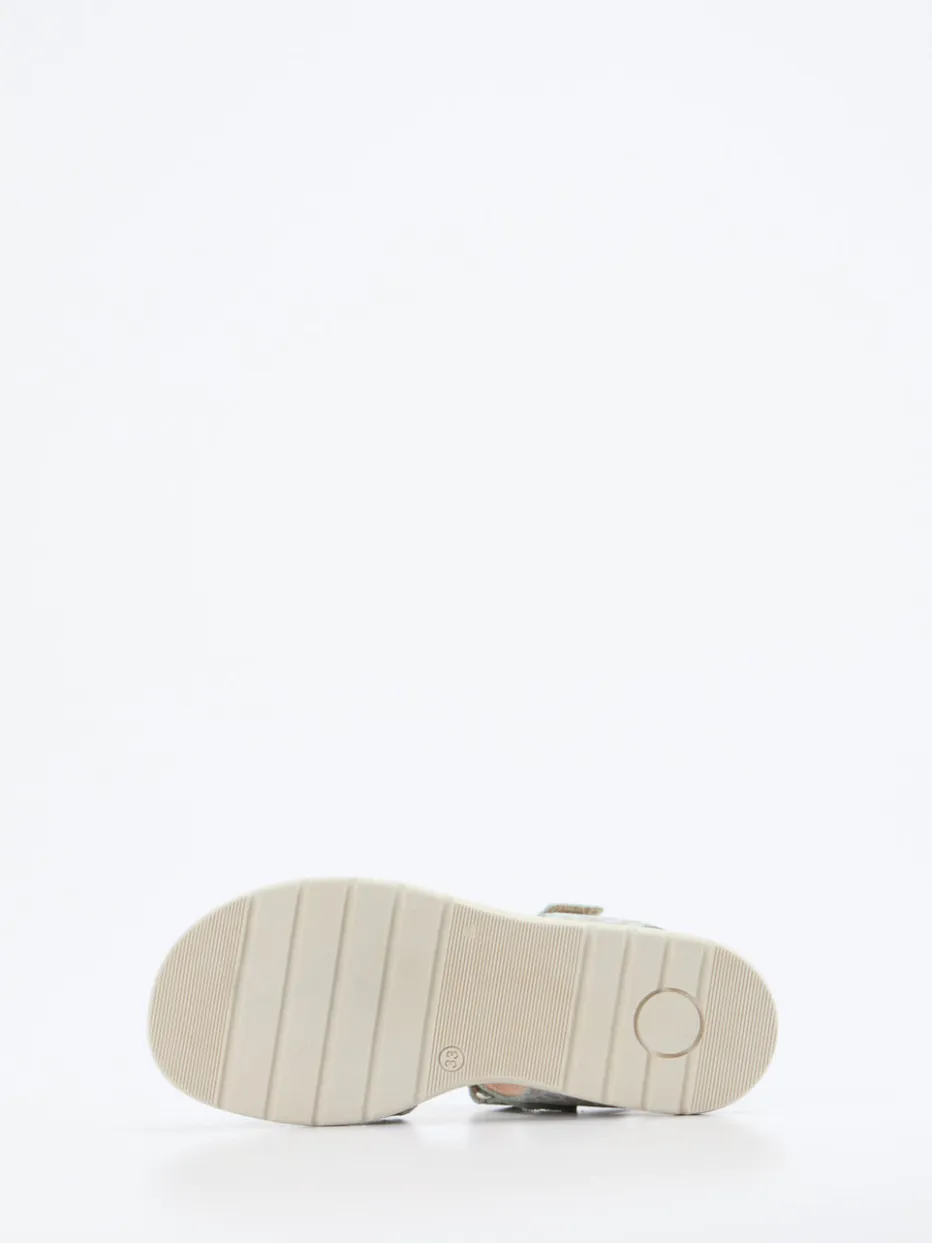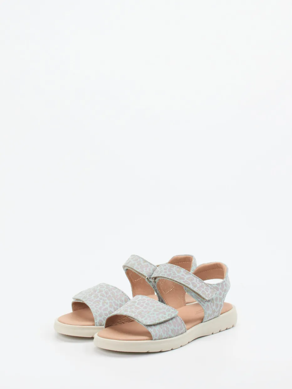 Diese Mädchensandale vereint geprägtes Leder in sanften Pastelltönen mit kindgerechtem Komfort – ideal für warme Tage im Alltag und auf Reisen.