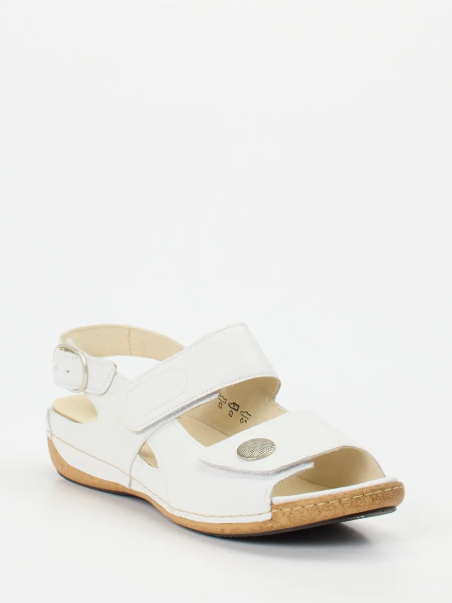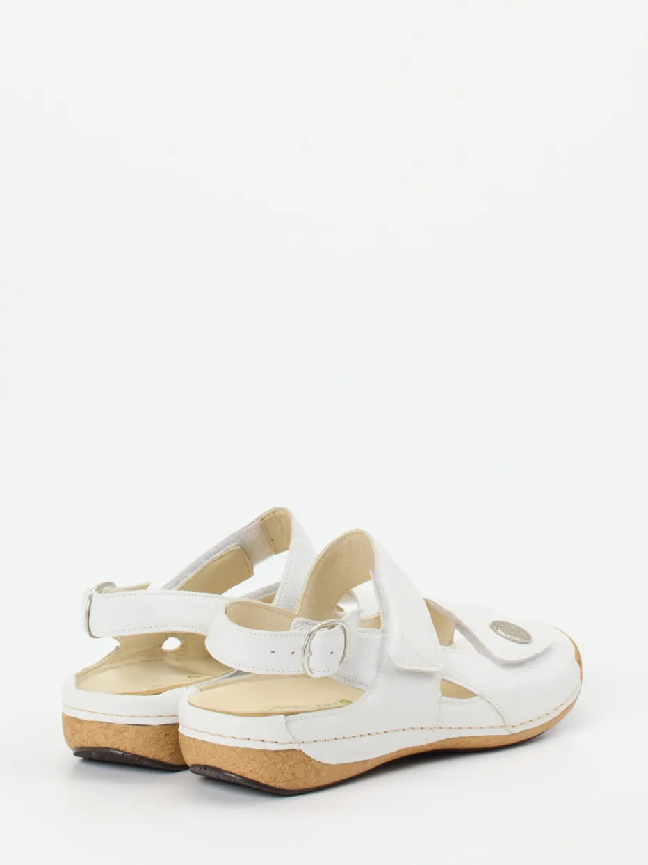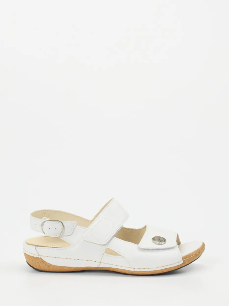 Schlicht, hochwertig, durchdacht.Die Marke Waldläufer bringt mit dieser Damen-Sandale ein Modell auf den Punkt, das Komfort und dezente Ästhetik vereint. Ob im Alltag oder in der Freizeit – diese weiße Sandale mit ergonomisch geformtem Fußbett bietet durch feines, genarbtes Kalbleder spürbaren Tragekomfort. Zwei Klettverschlüsse und ein Fersenriemen mit silberfarbener Dornschließe ermöglichen individuelle Anpassung. Die Kork-Gummisohle mit sichtbarer Naht betont den funktionalen Charakter, während ein Metallknopf für ein stilvolles Detail sorgt. Inspiriert vom Quiet-Luxury-Trend überzeugt sie im Zusammenspiel mit natürlichen Materialien. Ein Bequemschuh mit Stil, wie man ihn von Waldläufer erwartet.