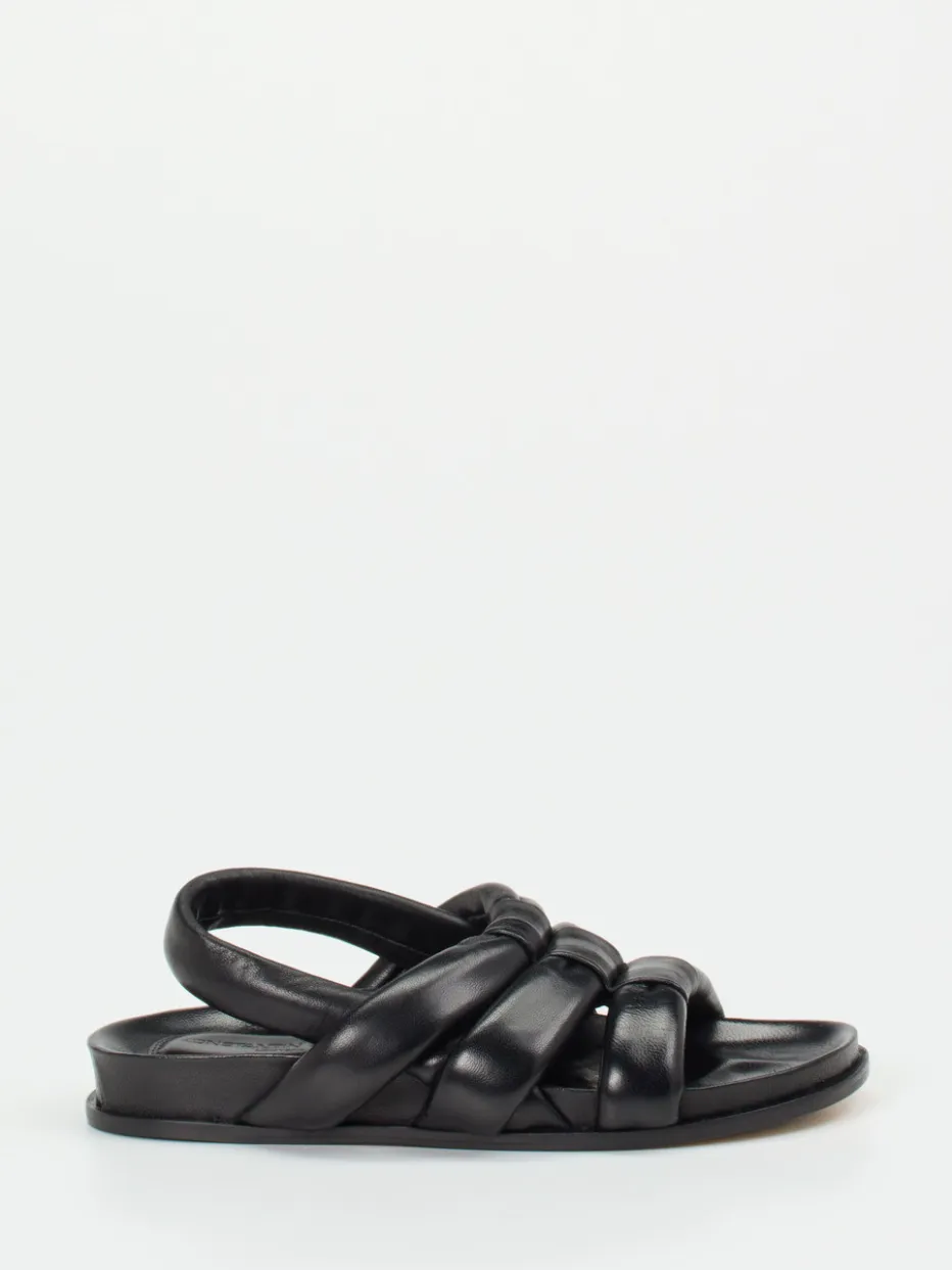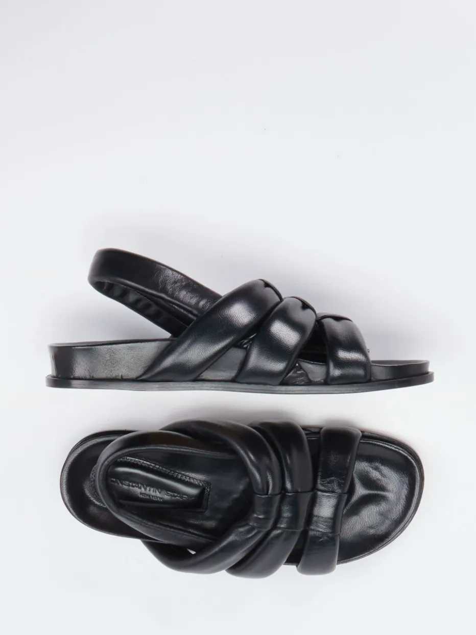 Sommerlicher Komfort im puristischen Design.Konstantin Starke präsentiert eine Damen-Sandale, die sowohl modisch als auch komfortorientiert überzeugt. Ideal für Freizeit, Urlaub oder warme Alltagstage bietet dieses Modell aus geschmeidigem Lammleder mit mattem Finish hochwertige Verarbeitung und ein angenehm soft gepolstertes Fußbett. Kreuz- und Fersenriemen sind voluminös gepolstert, was für maximale Bequemlichkeit sorgt, während die offene, flache Silhouette Trendbewusstsein und Leichtigkeit ausstrahlt. Das elastische Fersenband ermöglicht angenehmen Halt in Schlupfform. Inspiriert von Streetwear und Comfort Elegance, passt die schwarze Sandale optimal zu luftig-leichten Sommerlooks oder monochromen Outfits. Ein stilvolles Essential für moderne Komfortansprüche.