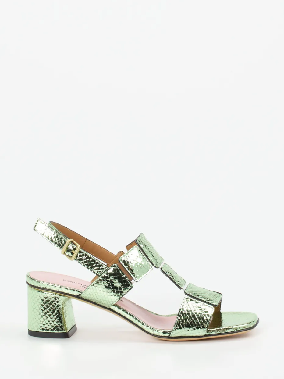 Die Statement-Sandale vereint Metallic-Minzgrün mit schimmernder Schlangenprägung und wirkt stilbildend für moderne Sommer-Looks. Ihr Blockabsatz sorgt für Komfort und modische Präsenz zugleich.