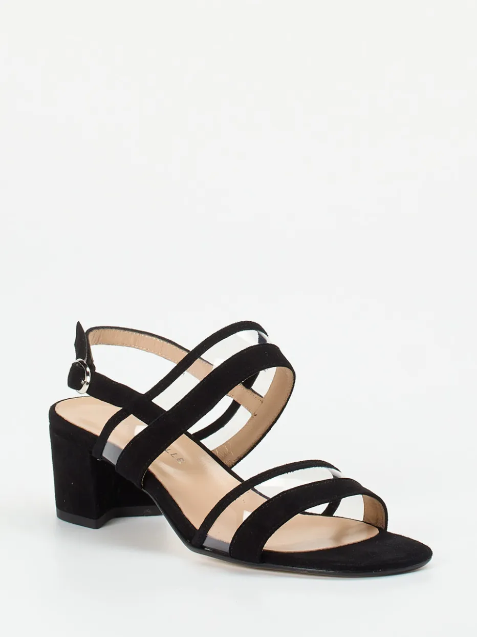 Sommerleicht und stilbewusst.Die Marke Cinzia Valle präsentiert eine Sandale mit femininer Ausstrahlung und modischem Minimalismus. Veloursleder mit samtiger Oberfläche trifft auf transparente Vinylriemen und schafft einen modernen Kontrast. Das elegante Schwarz unterstreicht die klare Linienführung des offenen, mehrriemigen Designs. Eine silberfarbene Schnalle erleichtert die Anpassung des Fersenriemens, während der lederbezogene 4 cm Blockabsatz und das weiche Innenleder Komfort versprechen. Transparentdetails greifen aktuelle Trends auf und verleihen der Form Leichtigkeit. Ideal für warme Tage und elegante Anlässe. Ein Modell mit stilvoller Präsenz und funktionalem Tragekomfort aus dem Hause Cinzia Valle.