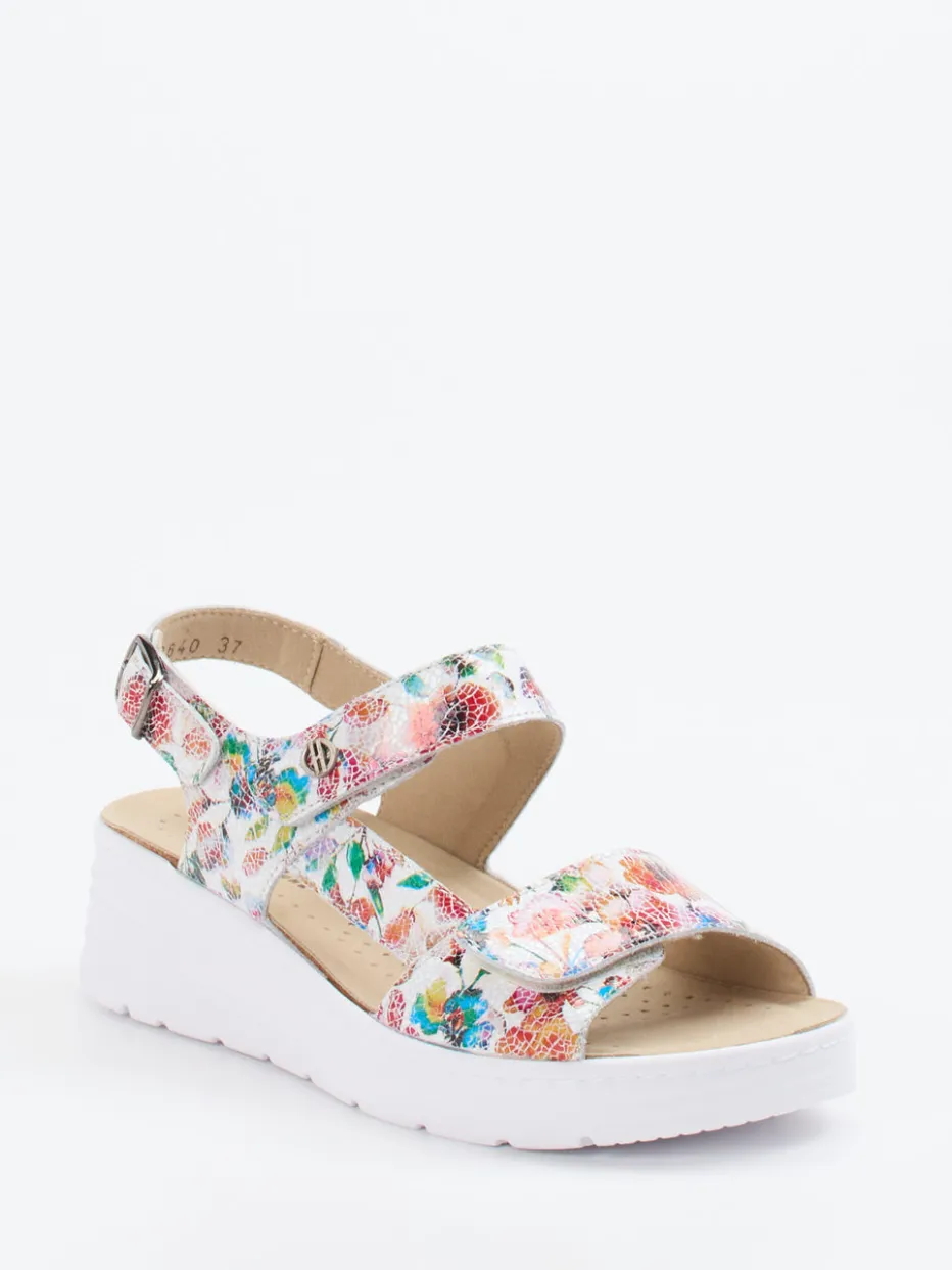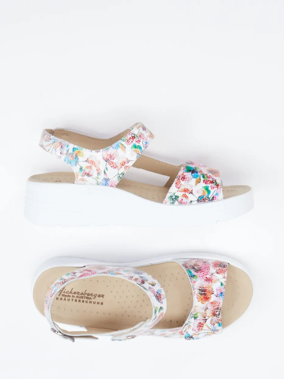 Sommerlich, bunt, bequem.Diese Komfort-Sandale von Hickersberger wurde speziell für entspannte Freizeitmomente und Urlaubstage entworfen. Das geprägte Leder zeigt sich in einer multicolor Farbgebung mit floralem Muster und zarter Glanzstruktur. Die offen gestaltete Silhouette bietet angenehme Belüftung, während Klettverschluss und eine verstellbare Fersenschnalle für optimalen Halt sorgen. Ein weich gepolstertes Fußbett sowie eine rutschhemmende PU-Sohle unterstreichen den Komfortanspruch. Das Design ist inspiriert von „Floral Prints SS24“ und findet idealen Einsatz bei sommerlichen Aktivitäten. Der farbenfrohe Look lässt sich wunderbar zu Leinenhosen oder pastellen Tuniken kombinieren – für individuelle Stilsicherheit mit Funktion.