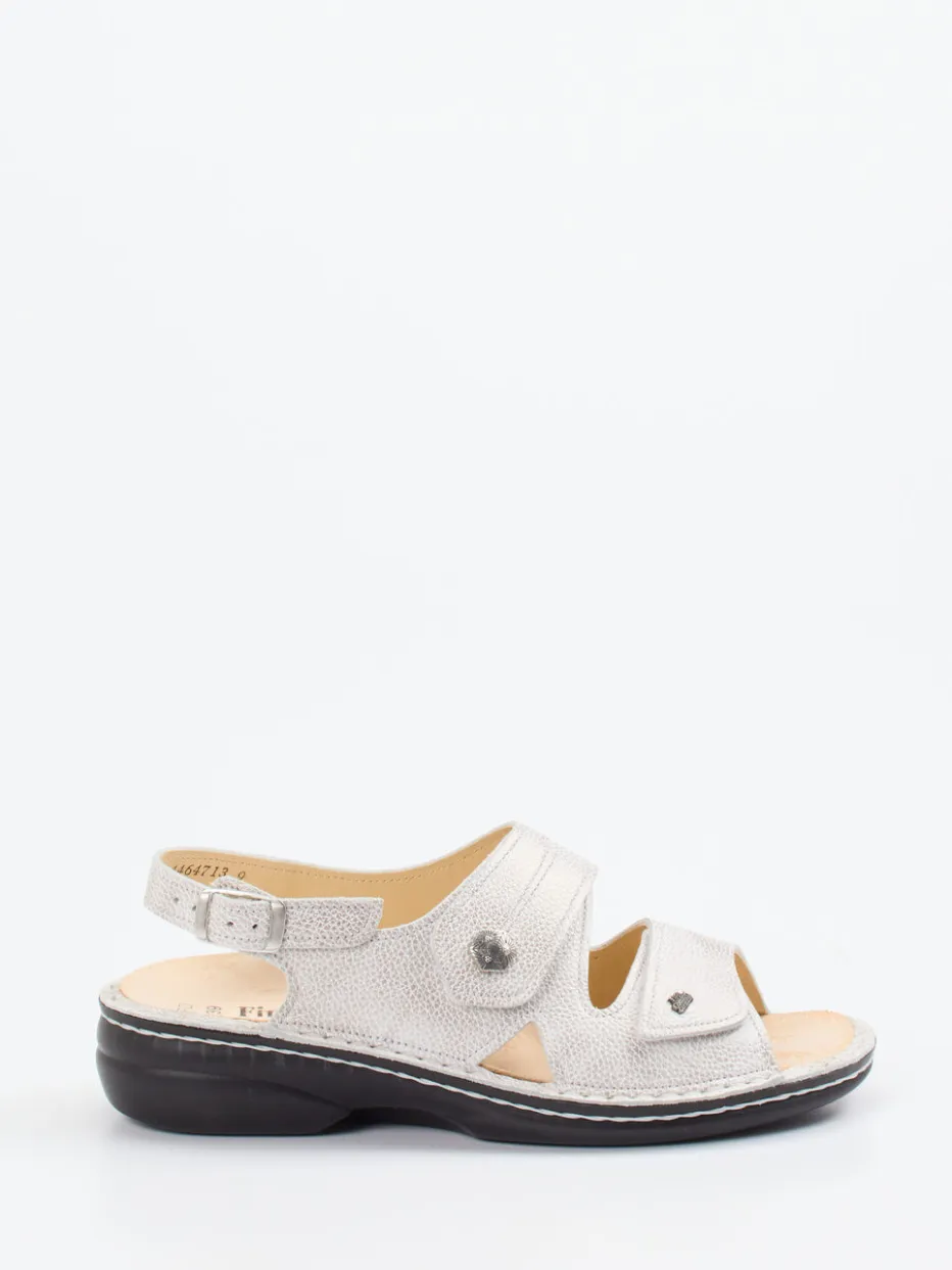 Stilvoller Komfort für den Alltag.Finn Comfort präsentiert mit dieser Damensandale ein funktionales Modell aus hochwertigem, silberbeigem Kalbleder in genarbter Optik. Perfekt für Freizeit und Alltagseinsatz bietet die offene Silhouette mit breiten Riemen, Klettverschlüssen und Fersenriemen samt Druckknopf individuellen Halt und hohen Tragekomfort. Silberfarbene Zierknöpfe und eine helle Kontrastnaht veredeln das schlichte Design. Die ergonomische Passform mit anatomischem, lederbezogenem Wechselfußbett und die rutschhemmende PU-Profilsohle unterstützen bequemes Gehen auch auf langen Wegen. Der dezente Farbton im Stil von Quiet Luxury ergänzt sommerlich-legeres Outfit ideal. Ein Gesundheitsschuh mit Stil – entwickelt für komfortbewusste Qualitätsliebhaberinnen.