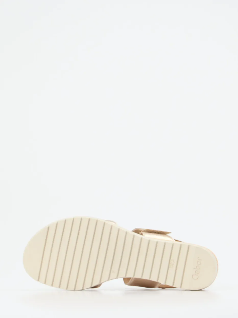 Perfekt für Sommer und Alltag.Gabor Comfort präsentiert mit dieser Bequemsandale ein Modell, das Design und Tragekomfort gekonnt vereint. Diese Sandalen aus schimmerndem Metallicleder in einem pudrigen Champagnerton bieten verstellbare Riemen mit Klettverschluss sowie eine auffällige runde Schnalle mit Metallic-Effekt. Das ergonomische Fußbett, gepolstert und mit Microfaser gefüttert, sorgt für angenehmen Tragekomfort, während die leichte Kork-Zwischensohle und die profilierte Gummisohle einen sicheren Tritt gewährleisten. Inspiriert von minimalistischen Formen und aktuellen Metallic-Trends der Saison, passt sie hervorragend zu Naturtönen oder sommerlichen Stoffen. Ein femininer Komfortschuh für stilvolle Leichtigkeit mit Gabor-typischem Anspruch an Alltagstauglichkeit.