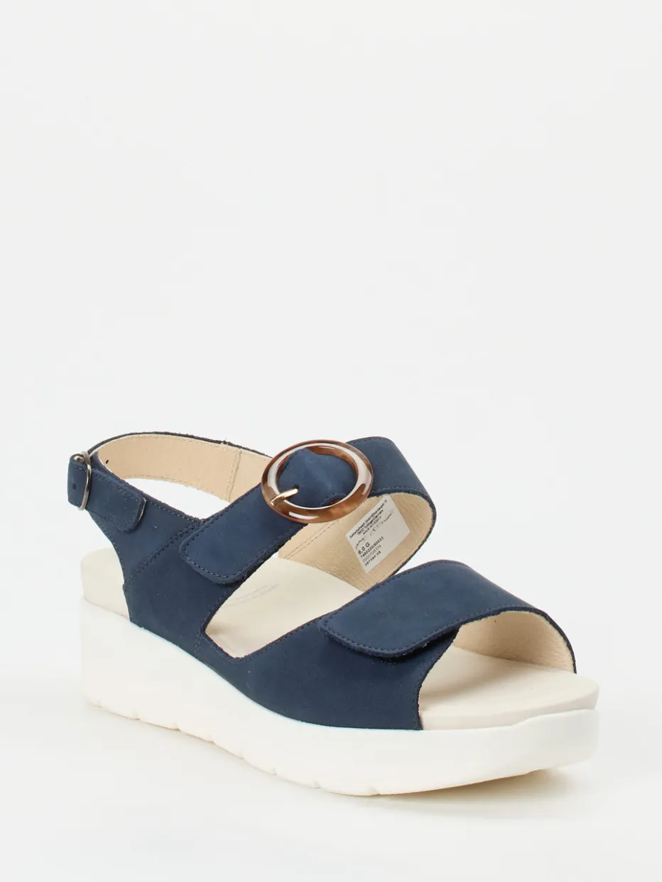 Sommerkomfort mit smartem Design.Die Damen-Sandale von Solidus kombiniert hochwertiges Nubukleder in Dunkelblau mit alltagstauglichem Komfort. Für entspannte Tage oder lange Wege überzeugt das Modell durch ein ergonomisches Fußbett, das auch für eigene Einlagen geeignet ist. Das samtig angeschliffene Nubukleder verleiht der offengeformten Silhouette eine edle, matte Anmutung. Verstellbare Riemen mit Klett- und Dornverschluss sichern passgenauen Sitz. Die leicht profilierte Gummisohle sorgt für gedämpften Auftritt. Die bernsteinfarbene Schnalle in Hornoptik und Ton-in-Ton-Nähte Akzentuieren den minimalistischen Stil. Besonders harmonisch zu Naturtextilien oder weit geschnittenen Sommerhosen. Solidus steht hier für spürbaren Komfort und sorgfältige Verarbeitung – ideal für anspruchsvolle Füße.