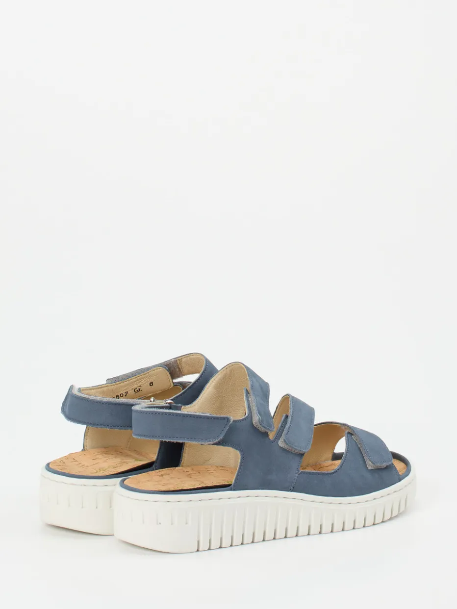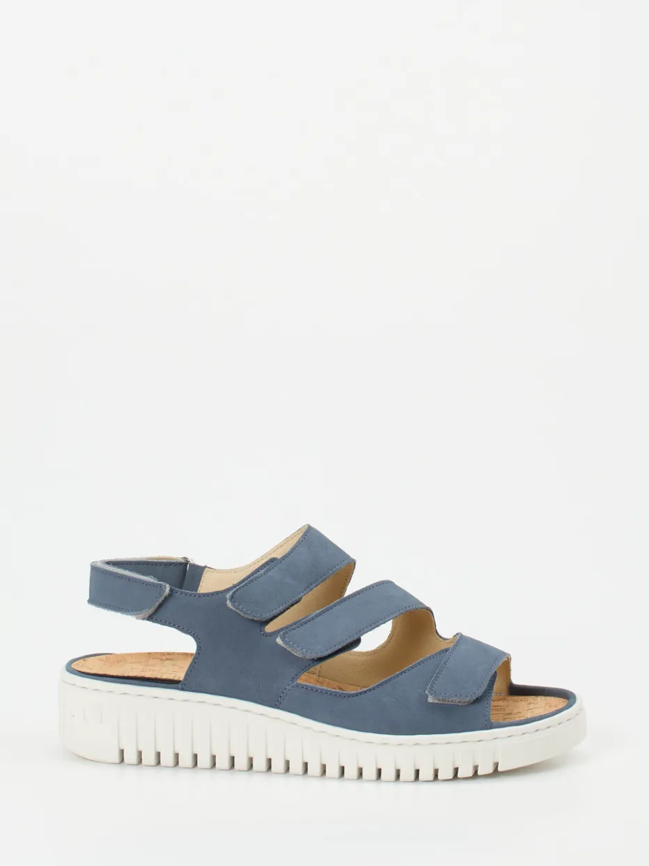 Sommerkomfort in jedem Schritt.Waldläufer präsentiert mit dieser Komfortsandale ein besonders durchdachtes Damenmodell. Ideal für Alltag und Freizeit, überzeugt die Sandale mit samtig angeschliffenem Nubukleder in Jeansblau und einer offen ergonomischen Form. Drei Klettverschlüsse – darunter ein praktischer Fersenriemen – sorgen für passgenauen Halt. Das weich gepolsterte, herausnehmbare Fußbett aus Kork unterstützt die natürliche Fußform. Die weiße Gummisohle mit strukturierter Profilierung bietet einen dezenten Kontrast zum Obermaterial und rundet das Design funktional ab. Stilistisch passt das Modell hervorragend zu sommerlicher Casualwear wie Leinenhose oder Shirt. Spürbar bequemer Gehkomfort mit typisch komfortabler Waldläufer-Leichtigkeit.