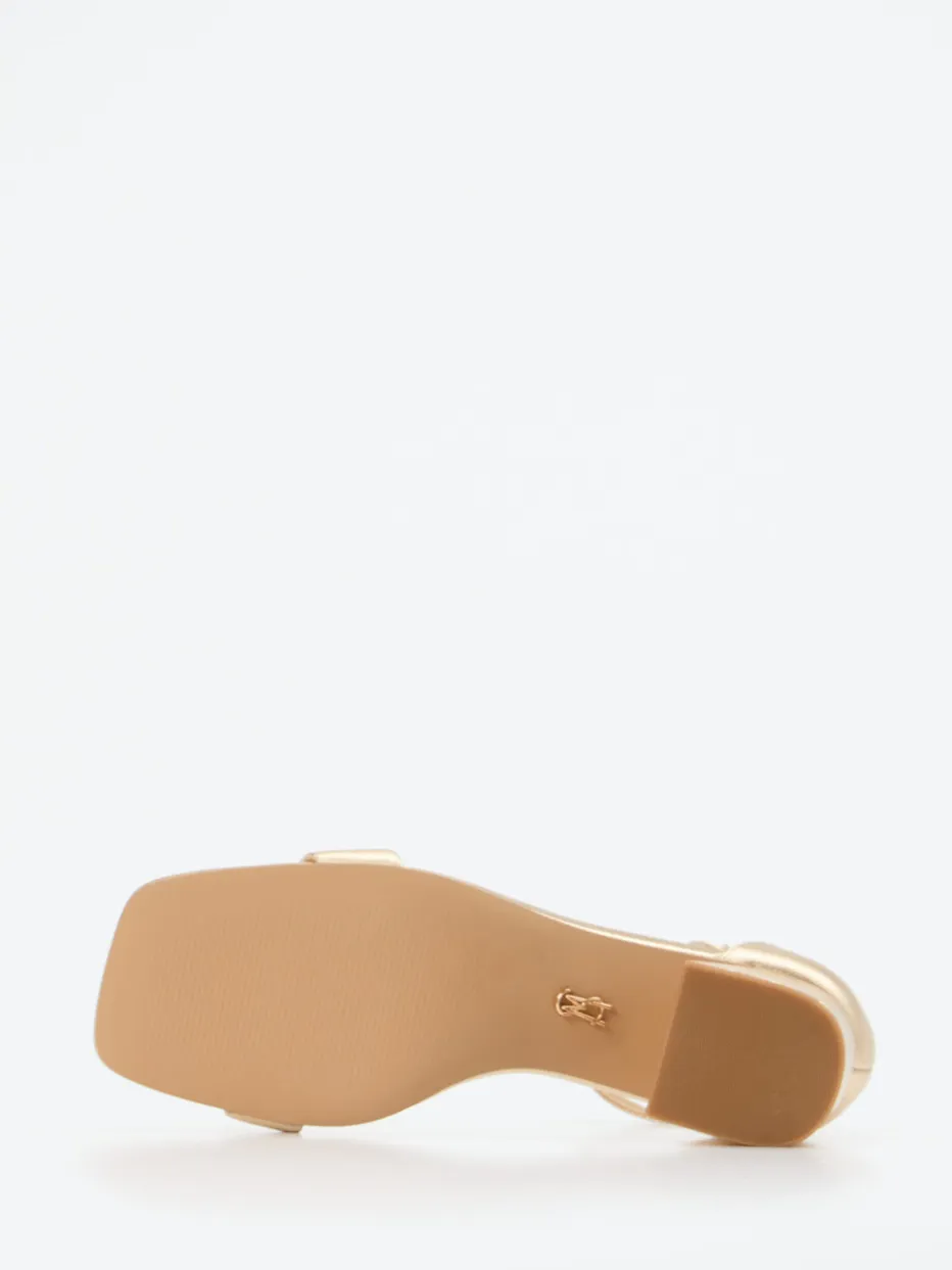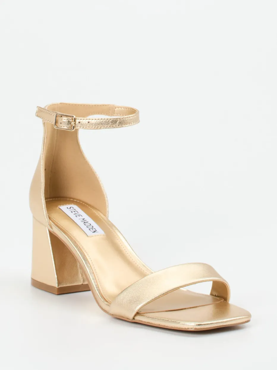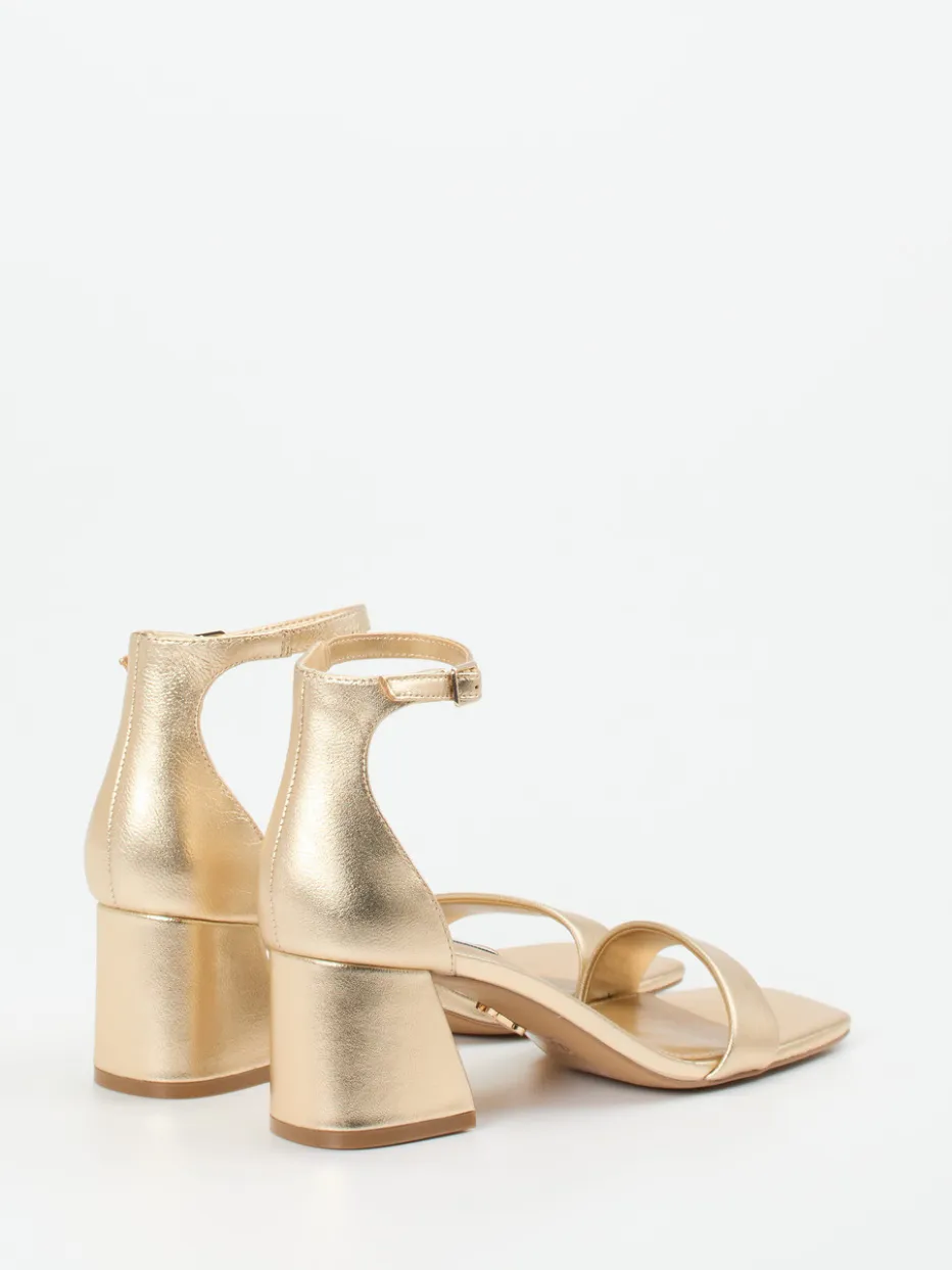 Diese goldfarbene Sandalette von Steve Madden kombiniert Metallicleder mit eckiger Formgebung und stabilem Blockabsatz – perfekt für moderne Abendlooks.