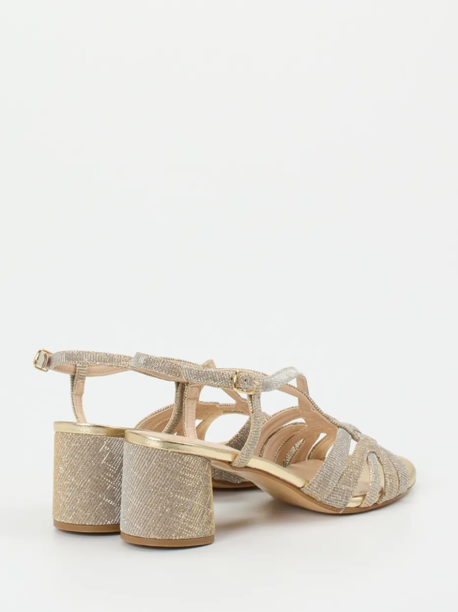 Diese eleganten Abendsandaletten mit glitzerndem Finish vereinen stilvolle Vintage-Ästhetik mit modernen Metallic-Akzenten – ideal für festliche Anlässe.