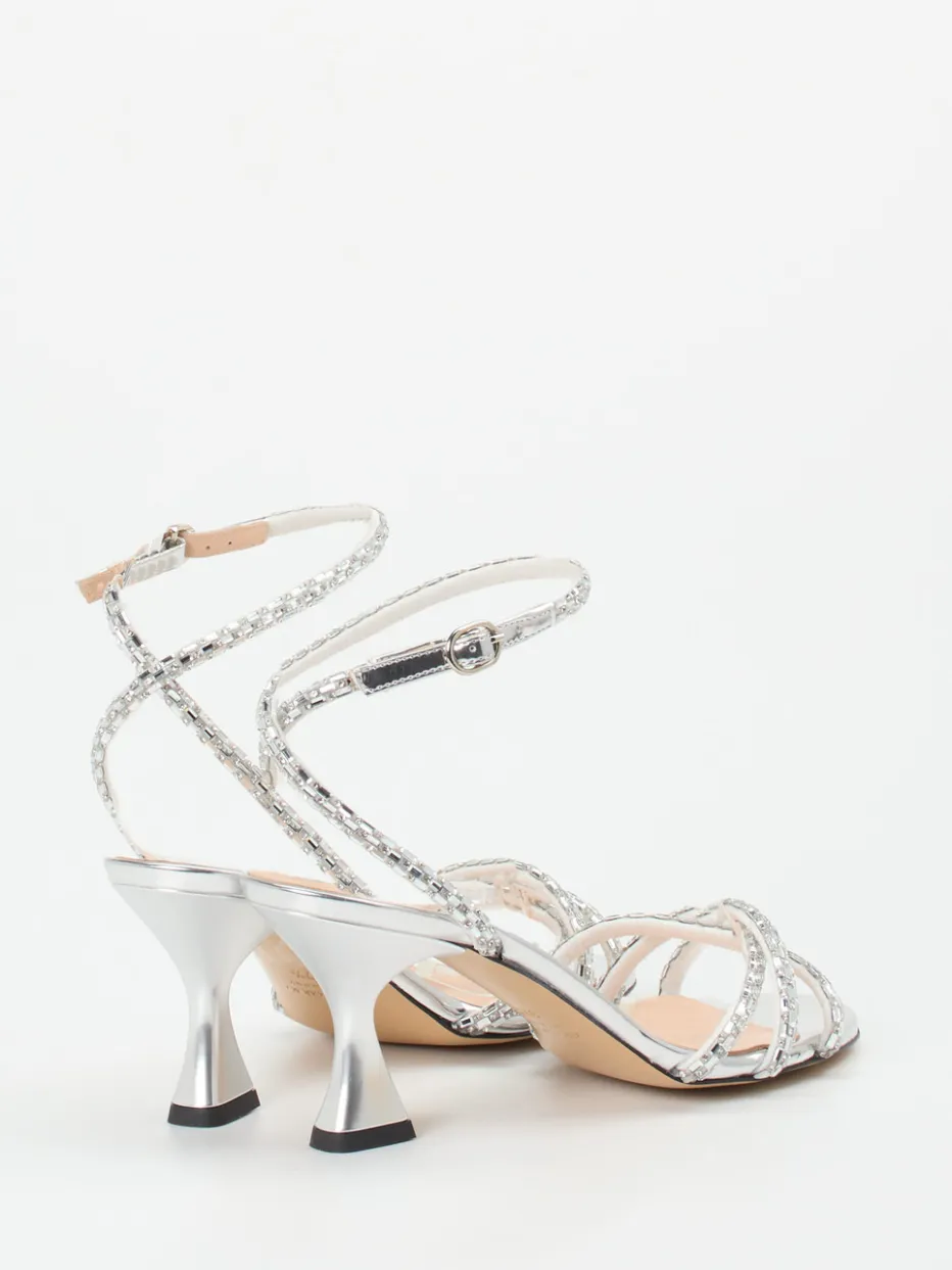 Die filigrane Silhouette mit strassbesetzten Riemen und der glänzende Metallic-Look machen diese Sandalette zur stilvollen Wahl für elegante Anlässe mit Glamour-Faktor.