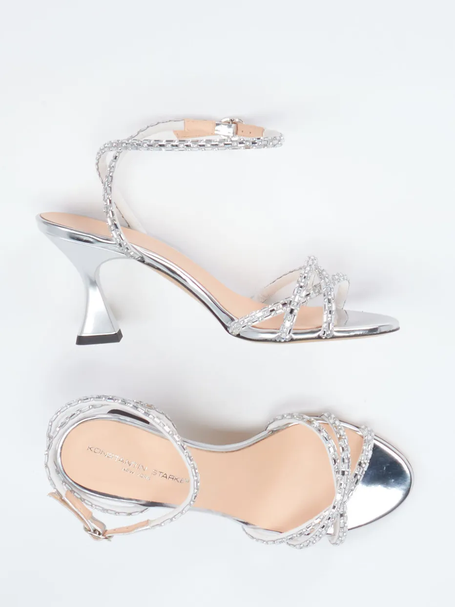 Eleganz mit Strahlkraft.Konstantin Starke präsentiert eine hochmodische High Heel Sandalette für Damen. Für Events mit Wow-Effekt überzeugt dieses Modell durch funkelnden Strassbesatz und einen extravaganten, geschwungenen Trichterabsatz. Das silberfarbene Metallicleder mit glänzender Oberfläche bildet den perfekten Hintergrund für die filigranen Riemen, deren Linienführung besonders elegant zur Geltung kommt. Der verstellbare Fesselriemen mit Schnalle sorgt für einen sicheren Sitz, während die gepolsterte Lederinnensohle angenehmen Tragekomfort bietet. Ein Must-have im Y2K-Revival und prädestiniert für feierliche Anlässe oder glamouröse Nächte. Kombinierbar mit Clutches in Metallicoptik und edlem Haarschmuck. Stilkompetenz trifft auf formvollendete Ausstrahlung.