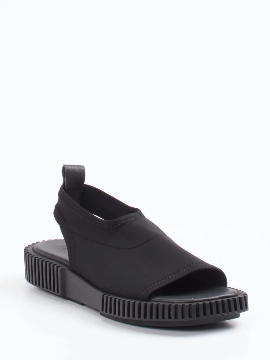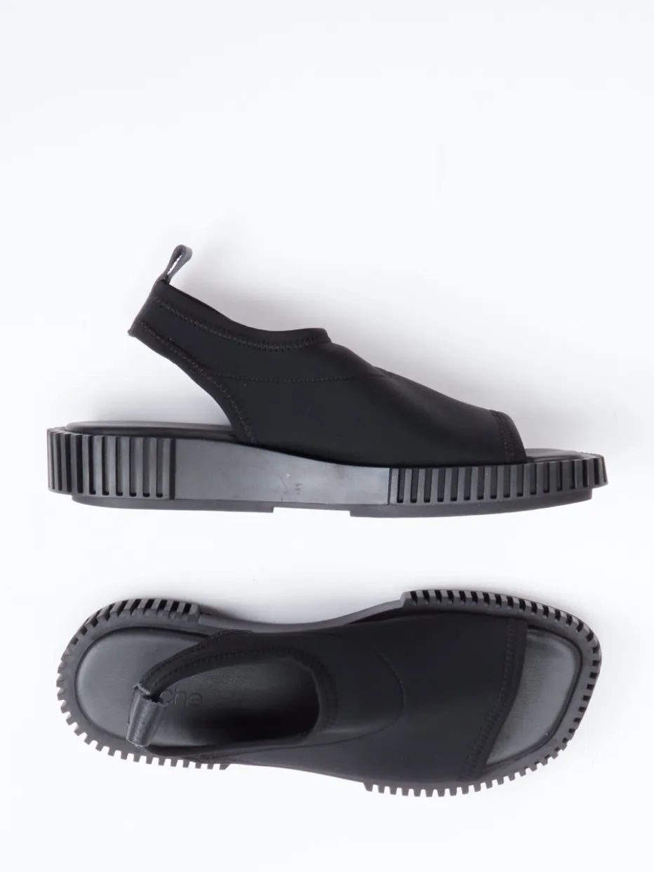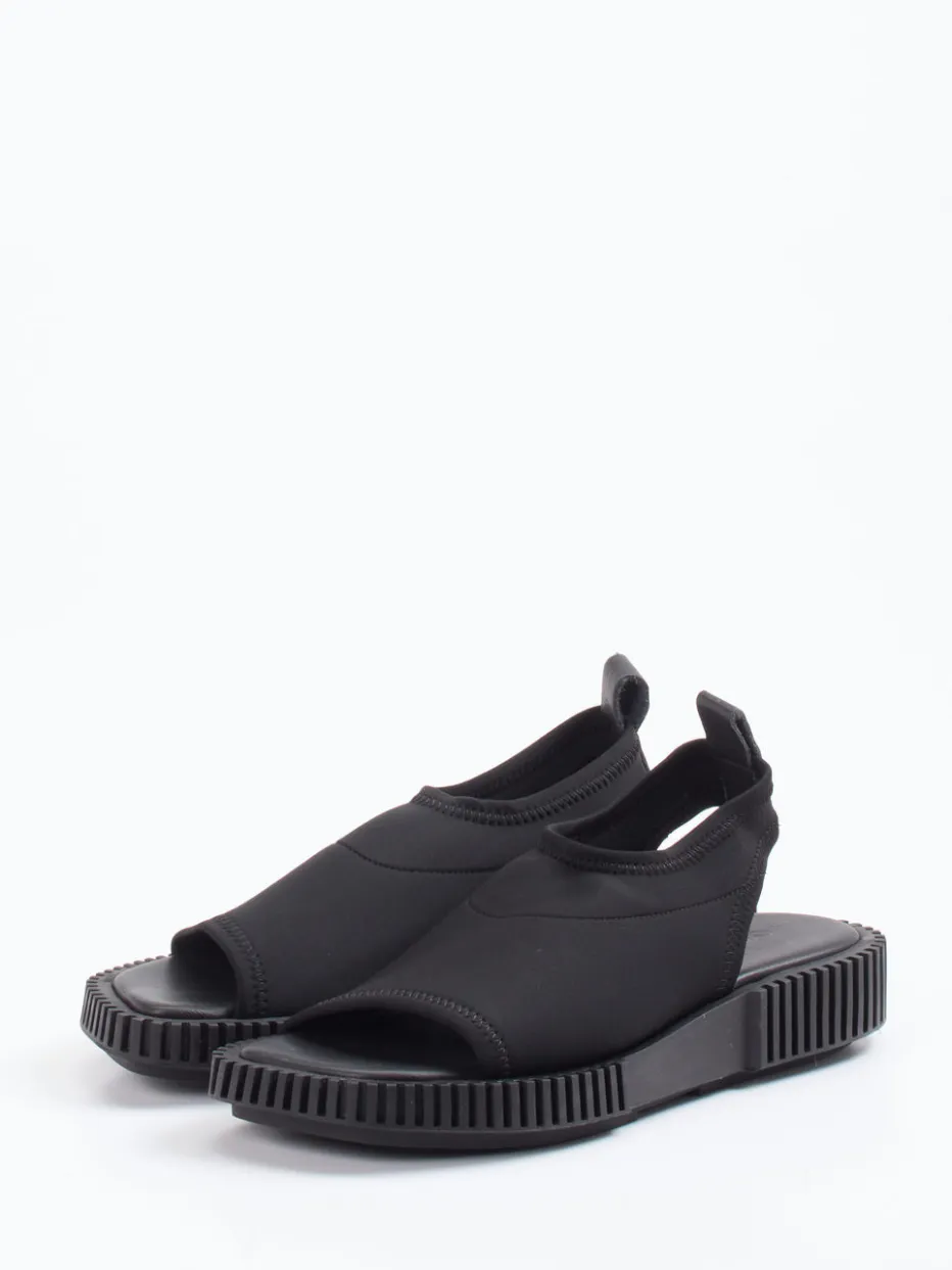 Minimalistisch trifft funktional.Die Marke Arche präsentiert eine moderne Damen-Sandalette mit sportivem Charakter. Für sommerliche Stadtabenteuer oder Urlaubsflair bietet diese Sandale sicheren Halt und angenehmen Komfort. Das schwarze Stretchmaterial schmiegt sich passgenau an den Fuß und erinnert in seiner Beschaffenheit an elastisches Neopren – samtig-matt und anschmiegsam. Die geschlossen gearbeitete Front unterstützt Stabilität, während Ferse und Zehen offen gestaltet sind. Auffallend ist die profilierte Gummisohle mit Ton-in-Ton-Struktur und moderner Plateaoform, ergänzt durch die dezente Zuglasche am Fersenriemen. Ein klarer Look im Zeichen von Minimalismus und Techno-Attitüde. Typischer Arche-Komfort in urban inspirierter Formensprache.