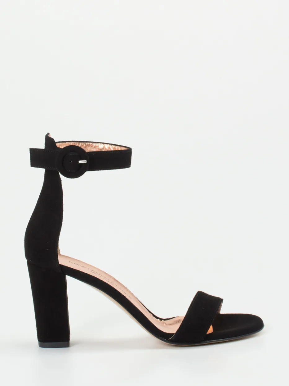 Schwarzes Veloursleder mit samtiger Oberfläche verleiht den feinen Riemchen eine edle Anmutung. Das glanzvolle Innenfutter in Roségold sorgt für einen raffinierten Kontrast. Der blockige, lederbezogene Absatz kombiniert Stil mit stabiler Trittsicherheit – ganz im Sinne des „Quiet Luxury“-Trends. Ideal für festliche Outfits und Minimal-Looks. Mit Clutch in Metallic-Optik entsteht ein harmonischer Abendlook.