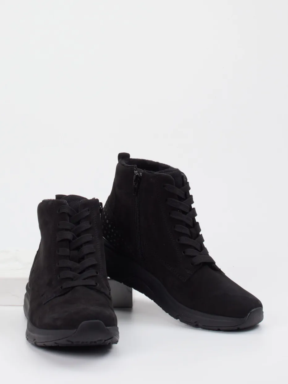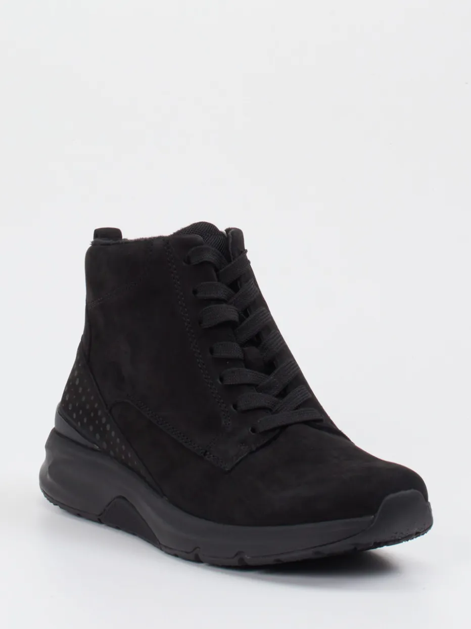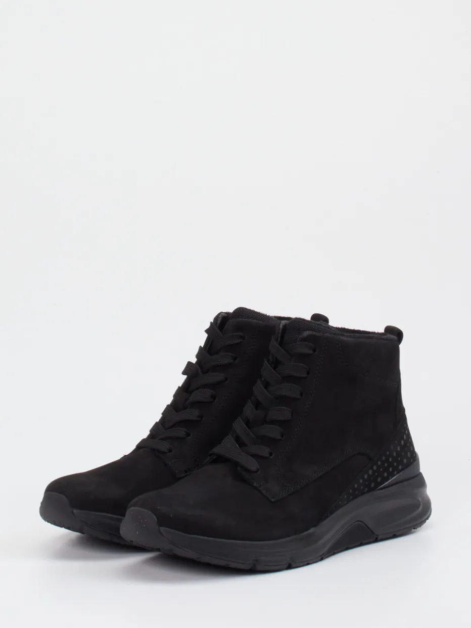 Urbaner Komfort durch klare Linien.Die Marke Gabor Comfort präsentiert mit dieser Damen-Stiefelette ein Modell für stilbewusste Alltagsszenarien. Das fein angeschliffene Nubukleder in mattem Schwarz unterstreicht den minimalistischen Charakter des knöchelhohen Boots. Schnürung und seitlicher Reißverschluss ermöglichen eine praktische Handhabung, während Microfaserfutter und profilierte Gummisohle für Wärme und sicheren Halt sorgen. Details wie punktuell perforierte Fersenzonen sowie Ton-in-Ton-Nähte runden das puristische Design ab. Ideal für Komfortliebhaberinnen mit Affinität zu Streetwear und dezenten All-Black-Looks. Die Kombination aus Materialien und Konstruktion verleiht dem Modell seinen typisch bequemen Gabor-Komfort.