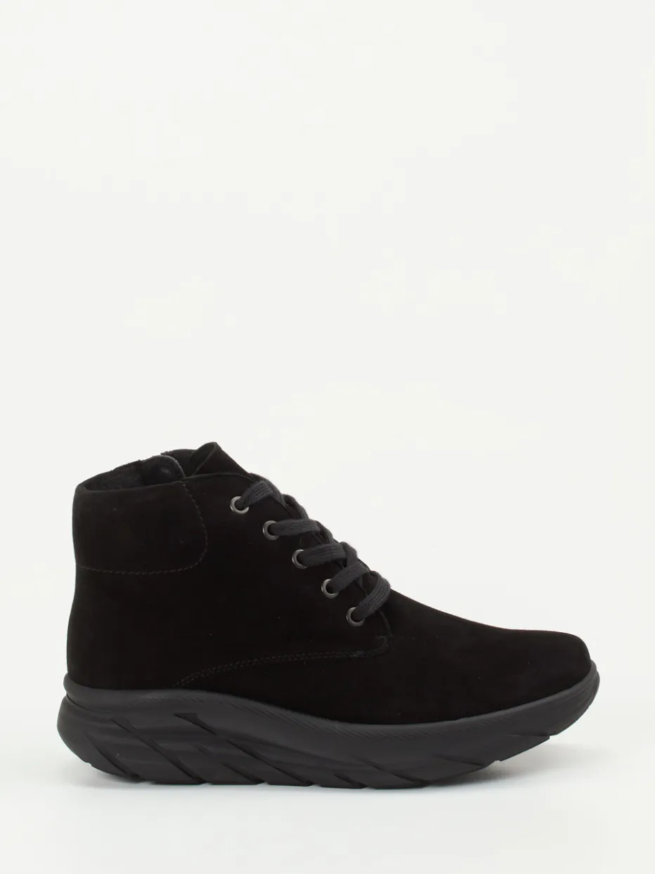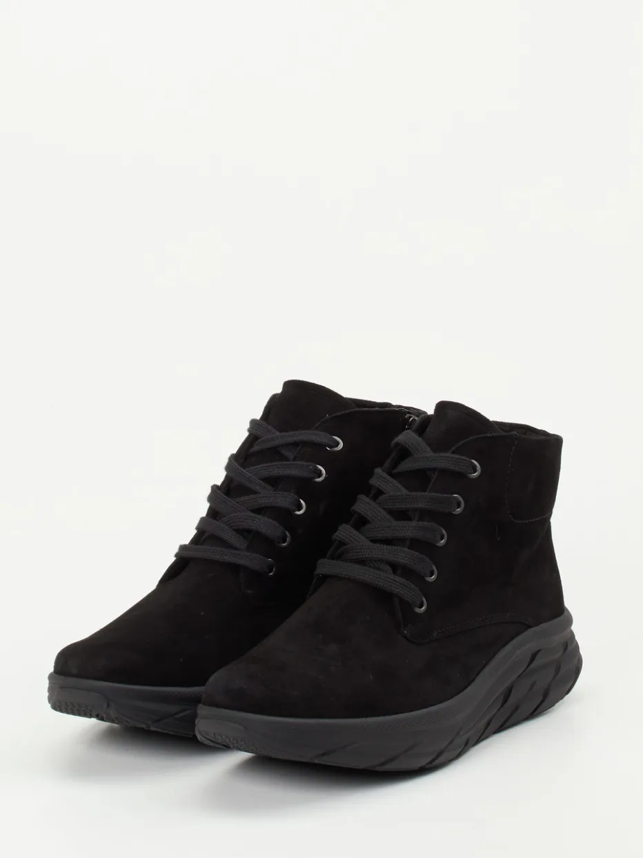 Puristischer Komfort trifft auf urbanen Chic.Die Marke Semler präsentiert robuste Damen-Stiefeletten in sportlich-lässigem Design. Ideal für kühle Tage in der Stadt oder gemütliche Spaziergänge – diese Schnür-Boots bestehen aus samtig angeschliffenem, schwarzem Veloursleder. Die knöchelhohe Form wird durch eine Ton-in-Ton-Schnürung und einen seitlichen Reißverschluss ergänzt, der den Einstieg erleichtert. Eine leichte, voluminöse Profilsohle sorgt für rutschfesten Halt und setzt einen modernen Akzent. Innen verwöhnt ein weiches Textilfutter, das zuverlässig warm hält. Das herausnehmbare Fußbett bietet Raum für individuelle Einlagen. Ein rundum durchdachtes Design mit Bequemschuh-Komfort im minimalistischen Look von Semler.