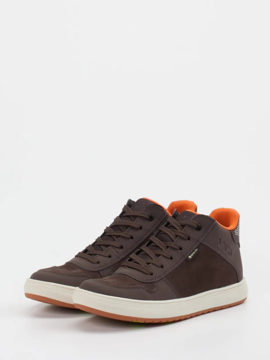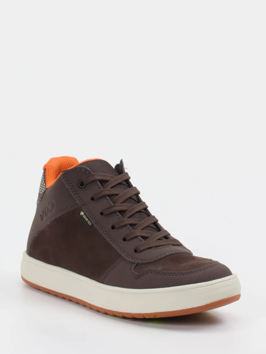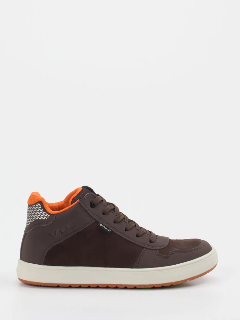 Ideal für aktive Tage im Freien: Das Modell vereint robustes Veloursleder mit einer samtig-matten Oberfläche und ist dank integrierter GORE-TEX-Membran atmungsaktiv sowie wasserabweisend. Die schokobraune Basisfarbe wird durch ein orangefarbenes Innenfutter und reflektierende Fersenelemente kontrastreich ergänzt. Ein gepolsterter Schaft sorgt für Tragekomfort, während die profilierte Gummisohle zuverlässigen Halt gibt – ob auf dem Schulweg oder beim Waldspaziergang. Inspiriert von Streetwear und Outdoor-Funktion, passt der Look zu funktionalen Kinderjacken und Funktionshosen.
