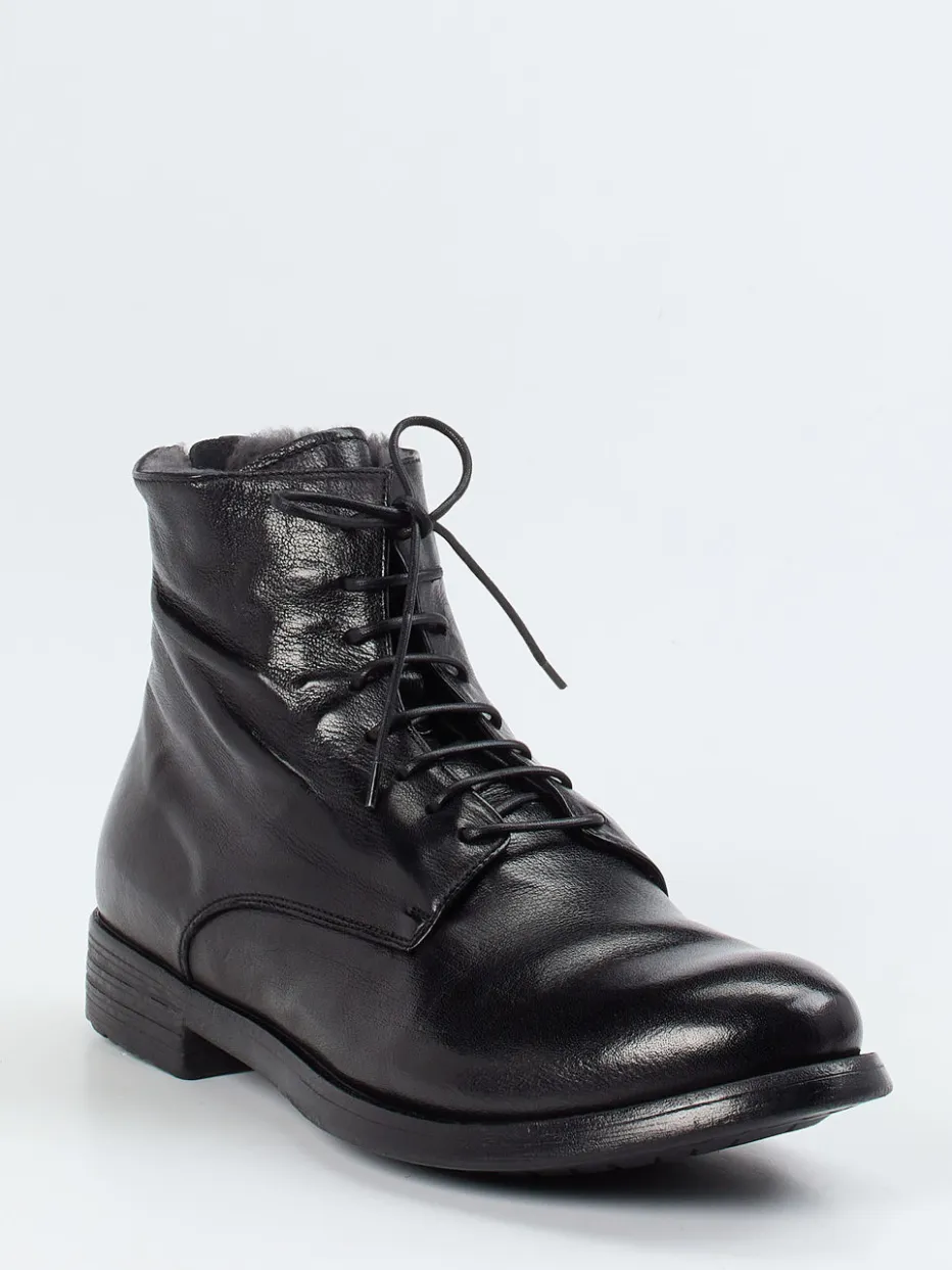 Stilsicher durch die kalte Jahreszeit.Officine Creative präsentiert mit diesen Schnürboots ein edles Herrenmodell für Herbst und Winter. Wenn urbaner Alltag und niedrige Temperaturen aufeinandertreffen, liefern diese Boots Komfort und Stil. Gefertigt aus schwarzem Büffelleder mit dezenter Glanzoptik vereinen sie klassische Silhouette mit funktionalem Detail: Der silberfarbene Reißverschluss an der Ferse ergänzt die individuelle Schnürung und ermöglicht bequemes An- und Ausziehen. Das innenliegende Lammfellfutter sorgt für wohlige Wärme, während die profilierte Gummisohle sicheren Halt bietet. Minimalistische Linien und hochwertige Materialien unterstreichen den Trend zu „Quiet Luxury“. Wärmender Komfort mit handwerklichem Anspruch – typisch Officine Creative.
