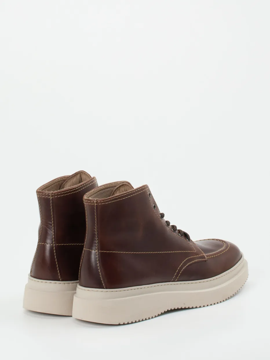 Authentischer Look trifft moderne Leichtigkeit.Konstantin Starke präsentiert mit diesen Herren-Schnürboots ein vielseitiges Modell für Alltag und Business. Das kastanienbraune Fettleder mit leichtem Glanz und beiger Kontrastnaht verleiht klassische Workwear-Ästhetik mit urbanem Anspruch. Die klare, hochgeschlossene Form wird ergänzt durch eine robuste Schnürung und eine profilierte Chunky-Sohle aus Gummi mit EXTRALIGHT-Technologie – ideal für lange Tage. Das ledergefütterte Innenleben inkl. Wechsel-Fußbett sorgt für ergonomischen Komfort. Stilistisch passen die Boots zu cleanem Denim und Naturtönen. Hochwertige Fertigung und maskulines Design stehen für Konstantin Starkes kompromisslosen Qualitätsanspruch.