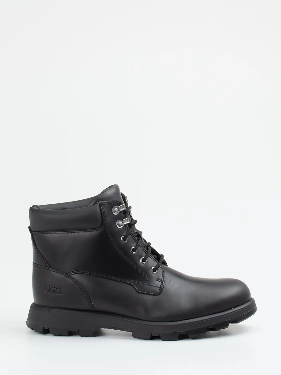 Funktion trifft auf minimalistischen Stil.Die Marke UGG präsentiert mit diesen Herren-Stiefeletten klassische Schnürboots für Herbst und Winter. Wenn das Wetter rauer wird, sorgt das wasserabweisende Fettleder mit matter Oberfläche und tonigen Nähten für trockene Füße. Die innenliegende Lammfellfütterung bietet wohlige Wärme, während silberfarbene Metallösen und die klassische Form optische Akzente setzen. Der gepolsterte Schaftrand erhöht den Tragekomfort – perfekt für funktionale Looks zwischen Stadt und Natur. Inspiriert von Workwear und Quiet Luxury-Trends entfaltet das Modell in Schwarz eine dezente, maskuline Wirkung. UGG vereint hochwertige Materialien mit alltagstauglicher Robustheit.