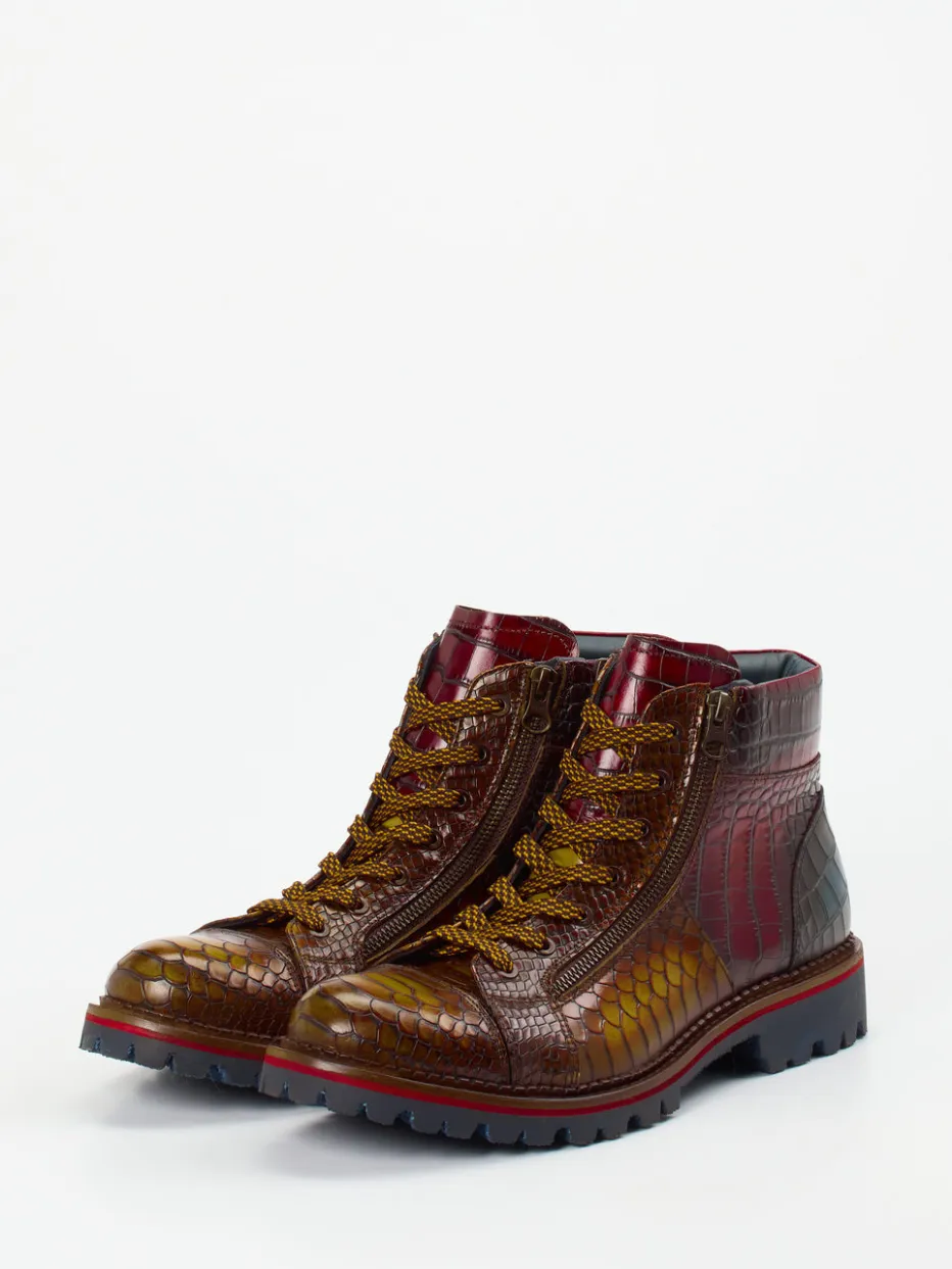 Krokogeprägtes Leder trifft auf changierenden Glanz: Diese Schnürboots vereinen markantes Design mit outdoorfähiger Funktionalität.