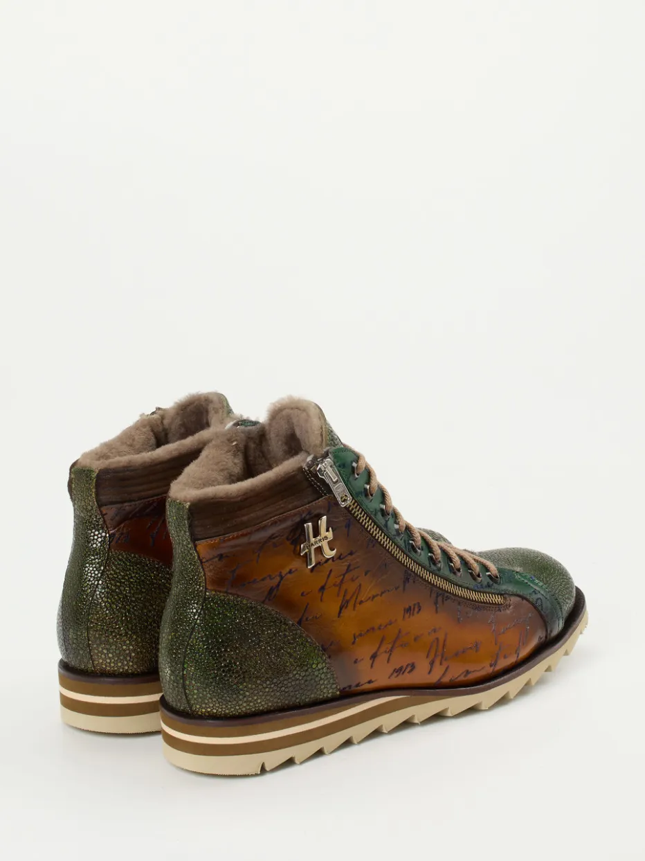 Cognacfarbenes Leder mit Reptilprägung und grüne Kontraste schaffen eine markante Vintage-Ästhetik. Gefüttert mit Lammfell und ausgestattet mit Profilsohle, überzeugen diese Boots auch funktional.