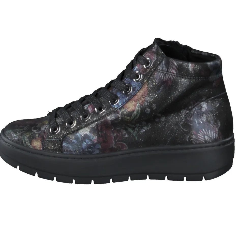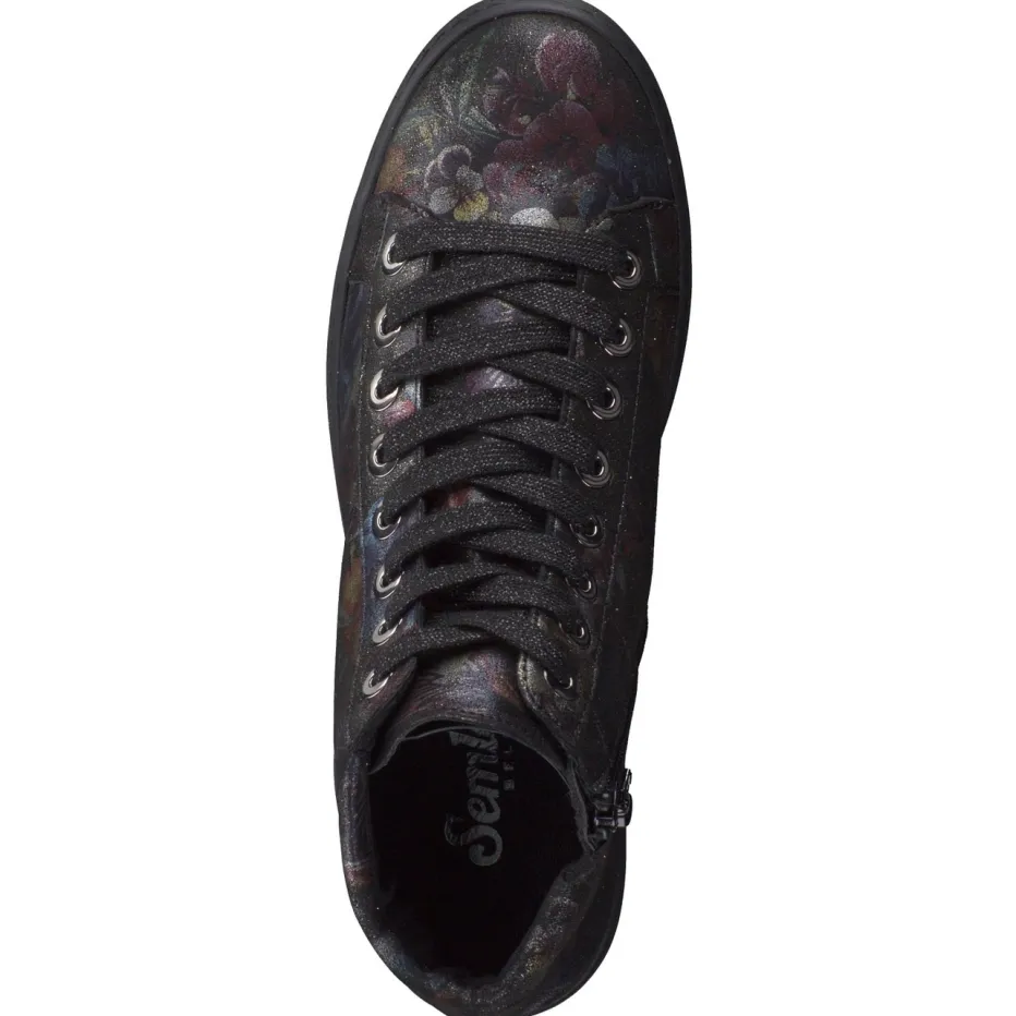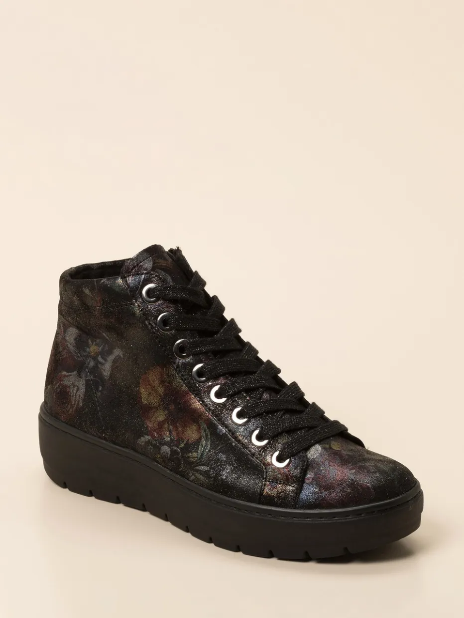 Schwarzgrundiges, geprägtes Leder mit buntem Blumenmuster und schimmerndem Glanz sorgt für einen starken Auftritt. Die knöchelhohe Silhouette mit seitlichem Reißverschluss und breiter Schnürung in silberfarbenen Ösen ist zugleich funktional und modisch. Eine luftgepolsterte PU-Sohle federt weich ab und lässt sich auch mit Einlagen tragen. Inspiriert von den Trends Dark Floral und Metallic Accents der Saison Herbst/Winter.